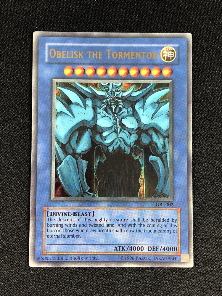 YUGIOH OBELISK THE TORMENTOR GB1-002 ULTRA PLAYED/EDGE WEAR ALL CARDS IN THIS AUCTION ARE IN NEAR MINT TO MINT CONDITION UNLESS STATED OTHERWISE IN THE TITLE. AND, YOU ARE GUARANTEED TO RECEIVE THE CARD NAMED IN THE TITLE. PLEASE NOTE, IF THERE'S MORE THAN 1 COPY AVAILABLE, YOU MAY NOT RECIEVE THE SAME EXACT CARD IN THE PHOTO. HOWEVER, IT WILL BE THE SAME EXACT CARD IN THE TITLE, AND DESCRIPTION! PLEASE CONTACT ME IF THERE IS ANYTHING WRONG WITH YOUR ORDER OR SHIPPING BEFORE LEAVING FEEDBACK. PLEASE GIVE ME A CHANCE TO FIX ANY PROBLEM YOU MAY HAVE. THANK YOU! Shipping Information: Shipping and Handling for this auction will be Free inside the United States - With Tracking! International Shipping Available Through Ebay’s Global Shipping Program. (BUYER IS RESPONSIBLE FOR ANY TAX) **Read the TITLE to see the condition of the cards Before you place a bid. Any damaged cards will be listed as such In The Title (FOR EXAMPLE: Blue Eyes White Dragon LOB-001 - Play/Edgewear). If it doesn't say anything about damage, it is in near-mint to mint condition. If you have any questions, message me Before you place your bid.** RETURN POLICY: RETURNS ARE ACCEPTED IF THE ITEM ARRIVES DAMAGED, OR NOT AS DESCRIBED. RETURNS ARE NOT ACCEPTED FOR BUYERS REMORSE. CHECK OUT MY OTHER AUCTIONS! _gsrx_vers_1516 (GS 9.3 (1516))