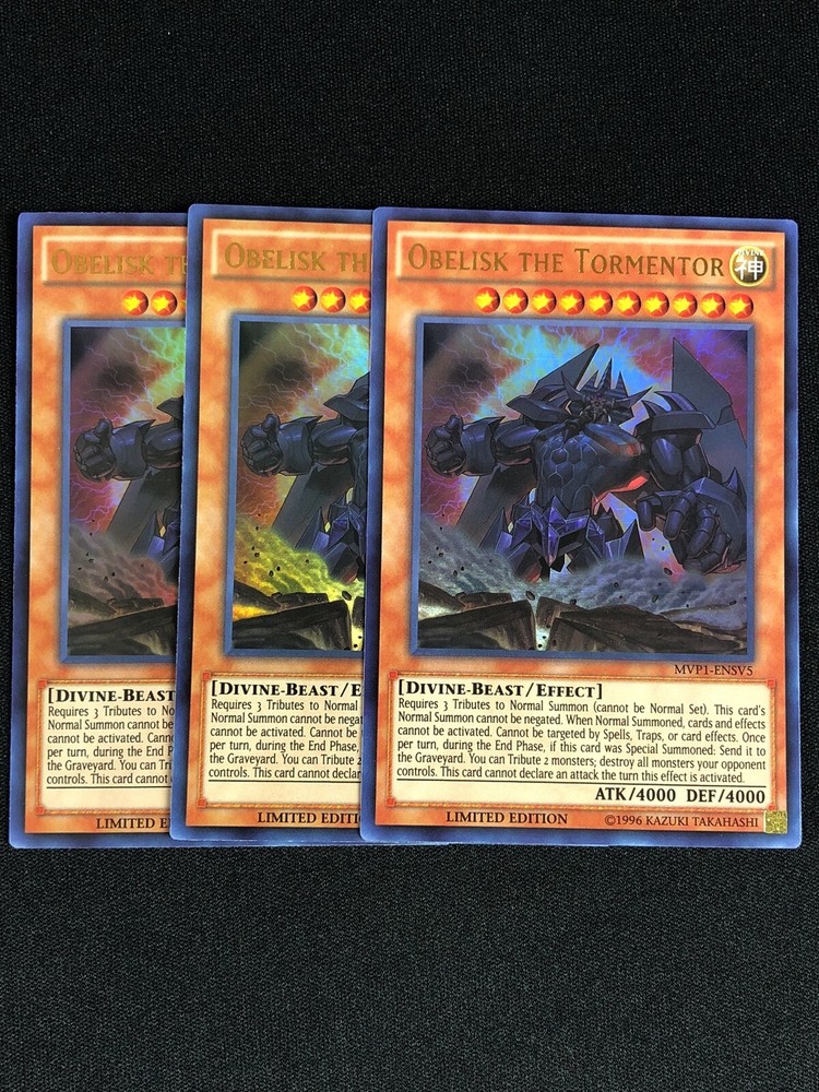 YUGIOH OBELISK THE TORMENTOR MVP1-ENSV5 ULTRA X3 ALL CARDS IN THIS AUCTION ARE IN NEAR MINT TO MINT CONDITION UNLESS STATED OTHERWISE IN THE TITLE. AND, YOU ARE GUARANTEED TO RECEIVE THE CARD NAMED IN THE TITLE. PLEASE NOTE, IF THERE'S MORE THAN 1 COPY AVAILABLE, YOU MAY NOT RECIEVE THE SAME EXACT CARD IN THE PHOTO. HOWEVER, IT WILL BE THE SAME EXACT CARD IN THE TITLE, AND DESCRIPTION! PLEASE CONTACT ME IF THERE IS ANYTHING WRONG WITH YOUR ORDER OR SHIPPING BEFORE LEAVING FEEDBACK. PLEASE GIVE ME A CHANCE TO FIX ANY PROBLEM YOU MAY HAVE. THANK YOU! Shipping Information: Shipping and Handling for this auction will be Free inside the United States - With Tracking! International Shipping Available Through Ebay’s Global Shipping Program. (BUYER IS RESPONSIBLE FOR ANY TAX) **Read the TITLE to see the condition of the cards Before you place a bid. Any damaged cards will be listed as such In The Title (FOR EXAMPLE: Blue Eyes White Dragon LOB-001 - Play/Edgewear). If it doesn't say anything about damage, it is in near-mint to mint condition. If you have any questions, message me Before you place your bid.** RETURN POLICY: RETURNS ARE ACCEPTED IF THE ITEM ARRIVES DAMAGED, OR NOT AS DESCRIBED. RETURNS ARE NOT ACCEPTED FOR BUYERS REMORSE. CHECK OUT MY OTHER AUCTIONS! _gsrx_vers_1516 (GS 9.3 (1516))
