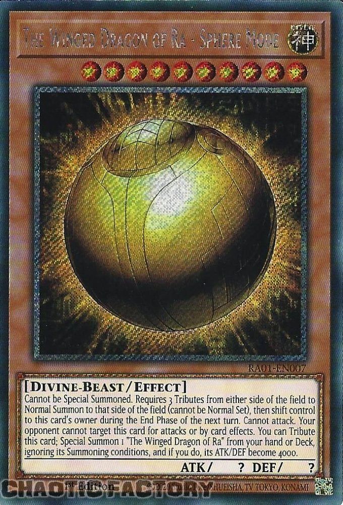 Platinum Secret Rare RA01-EN007 The Winged Dragon of Ra - Sphere Mode 1st Edition NM YU-GI-Oh! Product details (click to expand) Condtion Details NM Mint or Near mint LP Light Played, minor scatch or edge wear HP Heavy Played; very visible damages NOTE Refer to ebay's condition guide for further details Specifications (click to expand) SKU RA01-EN007-PLAT Model # Barcode # Brand YU-GI-Oh! Artist / Author Shipping Weight 0.0200kg Shipping Width 0.000m Shipping Height 0.000m Shipping Length 0.000m Shipping Cubic 0.000000000m3 Unit Of Measure ea Assembled Length 0.000m Assembled Height 0.000m Assembled Width 0.000m Type Format Delivery & Turn Around time (click to expand) Packing We always pack with toploader & soft sleeves Postage Method - Doemstic Standard Untracked Untrack letter post, delivery within 15 business days Domestic Tracked Tracked letter post, delivery within 15 business days with tracking Express Post Express Post; delivery after 2 to 3 business days after dispatch using AUSPOST's express network, exclusion applies; check auspost's website for details Turn Around time Dispatch 2 to 3 business days; which mean EXCLUDE WEEKEND © 2025 Chaotic Factory