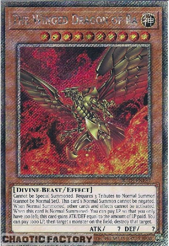 RA03-EN137 The Winged Dragon Of Ra Platinum Secret Rare 1st Edition NM YU-GI-Oh! Product details (click to expand) Condtion Details NM Mint or Near mint LP Light Played, minor scatch or edge wear HP Heavy Played; very visible damages NOTE Refer to ebay's condition guide for further details Specifications (click to expand) SKU RA03-EN137 Model # Barcode # Brand YU-GI-Oh! Artist / Author Shipping Weight 0.0200kg Shipping Width 0.000m Shipping Height 0.000m Shipping Length 0.000m Shipping Cubic 0.000000000m3 Unit Of Measure ea Assembled Length 0.000m Assembled Height 0.000m Assembled Width 0.000m Type Format Delivery & Turn Around time (click to expand) Packing We always pack with toploader & soft sleeves Postage Method - Doemstic Standard Untracked Untrack letter post, delivery within 15 business days Domestic Tracked Tracked letter post, delivery within 15 business days with tracking Express Post Express Post; delivery after 2 to 3 business days after dispatch using AUSPOST's express network, exclusion applies; check auspost's website for details Turn Around time Dispatch 2 to 3 business days; which mean EXCLUDE WEEKEND © 2025 Chaotic Factory