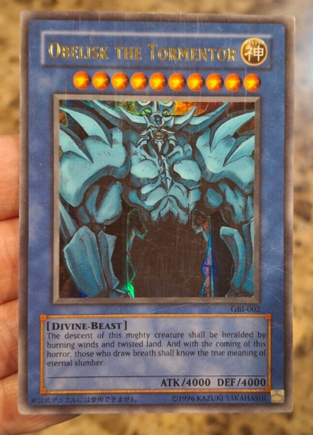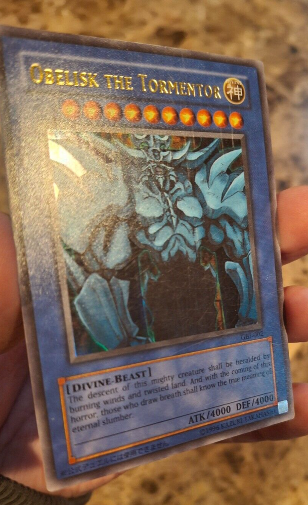 YUGIOH TCG OBELISK THE TORMENTOR CARD # GB1-002 CONDITION CAN BE SEEN IN PHOTOS CARD COMES IN TOP LOADER...