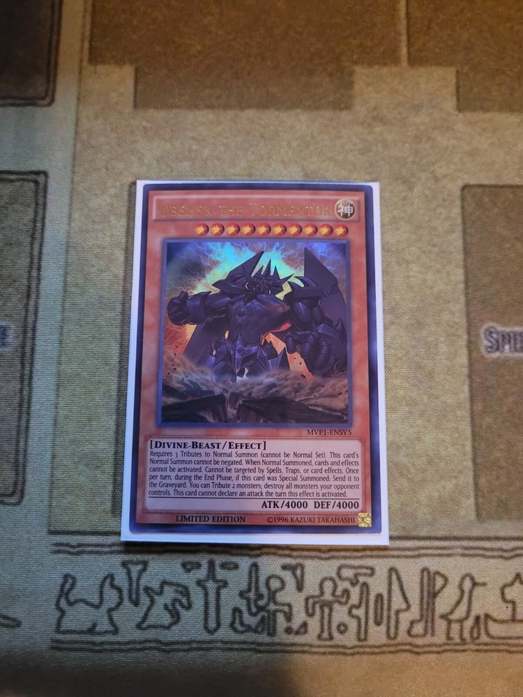 YUGIOH TCG OBELISK THE TORMENTOR MVP1-ENSV5 ULTRA LIMITED EDITION ALT ART NEAR MINT YOU GET WHATS SHOWN IN THE PICTURE AND DESCRIPTION ALL CARDS ARE SHIP WITH PROECTIONS. ALL CARDS THAT IS BELOW 20$ WELL BE SHIP IN PWE WITH EBAY TRACKING. 24$-21$ CARDS WELL BE WITH STAMPS PWE. CARDS ABOVE 25$ WELL BE SHIP IN BUBBLE MAIL WITH USPS GROUND SHIPPING TRACKING. IF YOUR ORDERS ADDS UP TO 25$ OR ABOVE IT WOULD BE ALSO IN A BUBBLE MAILER. IF YOU ARE FROM PUERTO RICO AND ARE BUYING MAKE SURE YOU HAVE "COUNTRY LIST AS UNITED STATES NOT PRI" OR ELSE I CAN'T PRINT EBAYSHIPPING LABEL WITH TRACKING AND WELL SENT ITEM BY STAMPS TO YOU. THANKS. To international buyers since I have been having many buyers that are using Fright Forward Services. YOU ARE BUYING AT YOUR OWN RISK. As I list in my description, I ship using PWE (Plain White Envelope) for cards that does not reach $25 and above. I do not know how the Fright Services pack it after mailing it to them. All I know is that many of the PWE does not make it to its original destination (your real home address) either it's the Fright Services fault for not packing it in bubble mailer or Usps for losing it in transit. If it is being send by PWE by the Fright Services, it made take months before getting there. Also, in case if its lost or does not make it to its destination you must direct your attention to the Fright Services before contacting me. It is not my responsibly for lost mail(item) due to 3rd party delivery. To make sure you get your cards to you faster and more accuracy you must order cards combining to $25 or above that way I can use Ground Advantage and send it in bubble mailer most of the bubble mailer I use will make it to its destination. Thank you. IF YOU CAN LEAVE FEEDBACKS THAT WOULD BE MUCH APPRECIATE THANK YOU FOR BUYING.