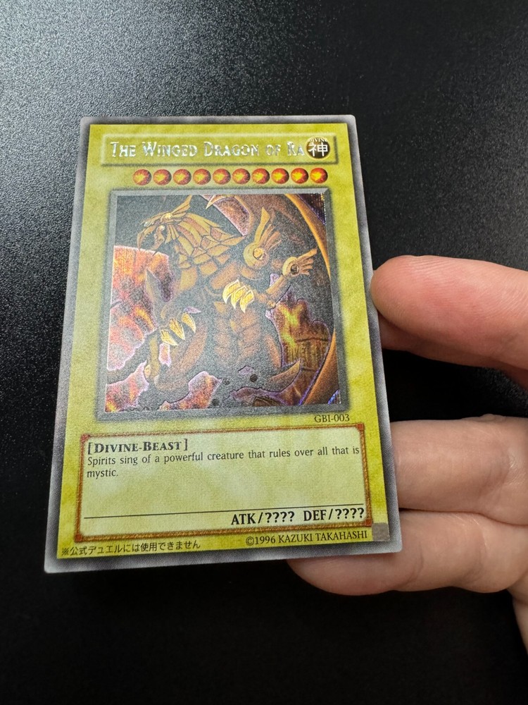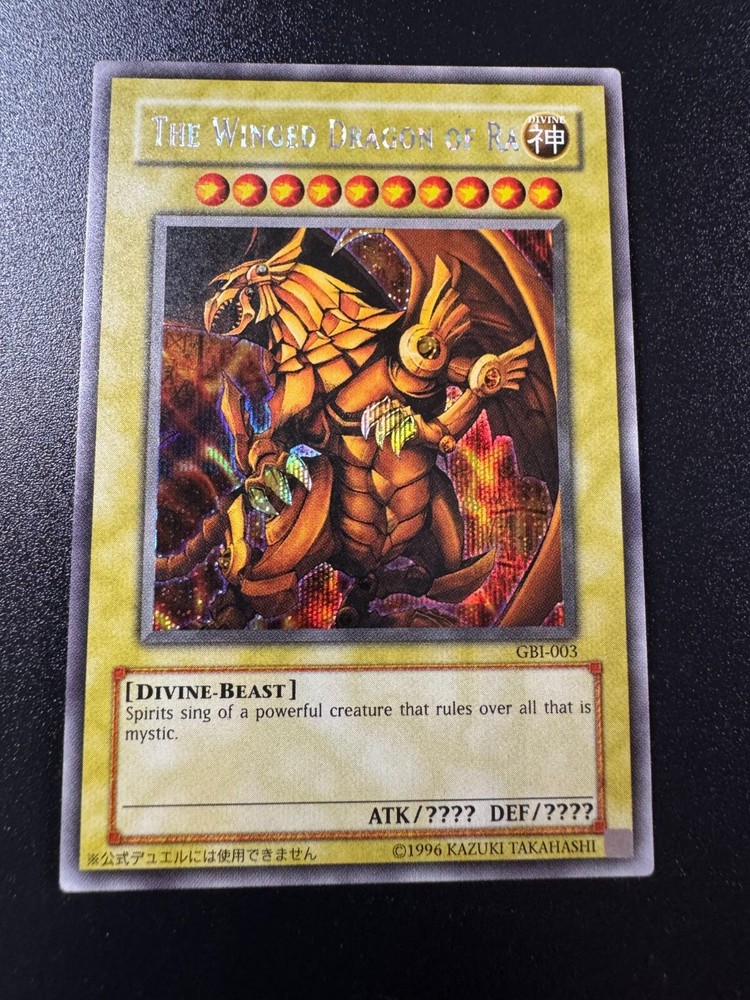 The Winged Dragon of Ra GBI Secret in Excellent condition. We refrain from listing cards as mint as sometimes the most minor wear goes unnoticed . All cards will be dispatched within two working days and come well-packaged in a toploader to avoid any damage in the post. Postage is completely free on all of our items. Please note that each listing is for 1 copy of the card(s) stated in the title unless otherwise specified; pictures are sometimes taken of every available copy to give you a better idea of the condition. Please feel free to send us a message with any questions you may have regarding an item, and happy bidding! Condition Grading Scale: Near Mint/NM - Possibility of a light imperfection, but usually pack fresh/unplayed. Excellent/EX - Might have slightly more wear/whitening than normal, or a faint crease/scratch/dent. Good/LP - Multiple marks/scuffing and/or multiple light creases/scratches, etc. Bad/HP - Heavily used. Will have combinations of edgewear, multiple marks and creases, etc. For most items below near mint condition, additional photographs will be provided to further detail the extent of any wear or damage. We regret that requests for photographs of cards on specific backgrounds or lighting are not possible.