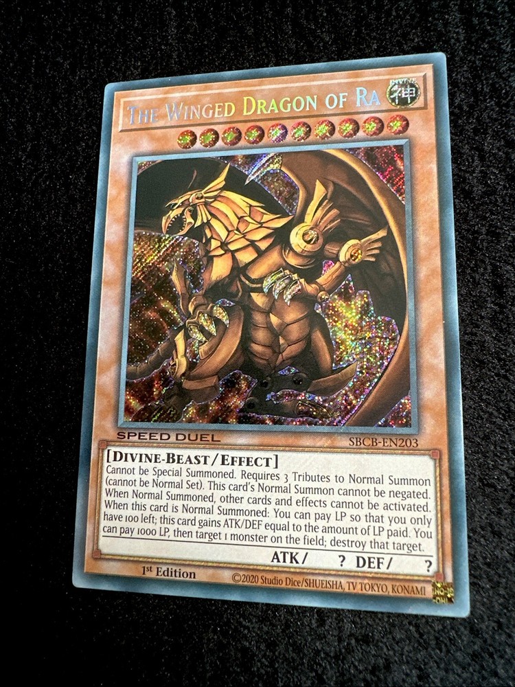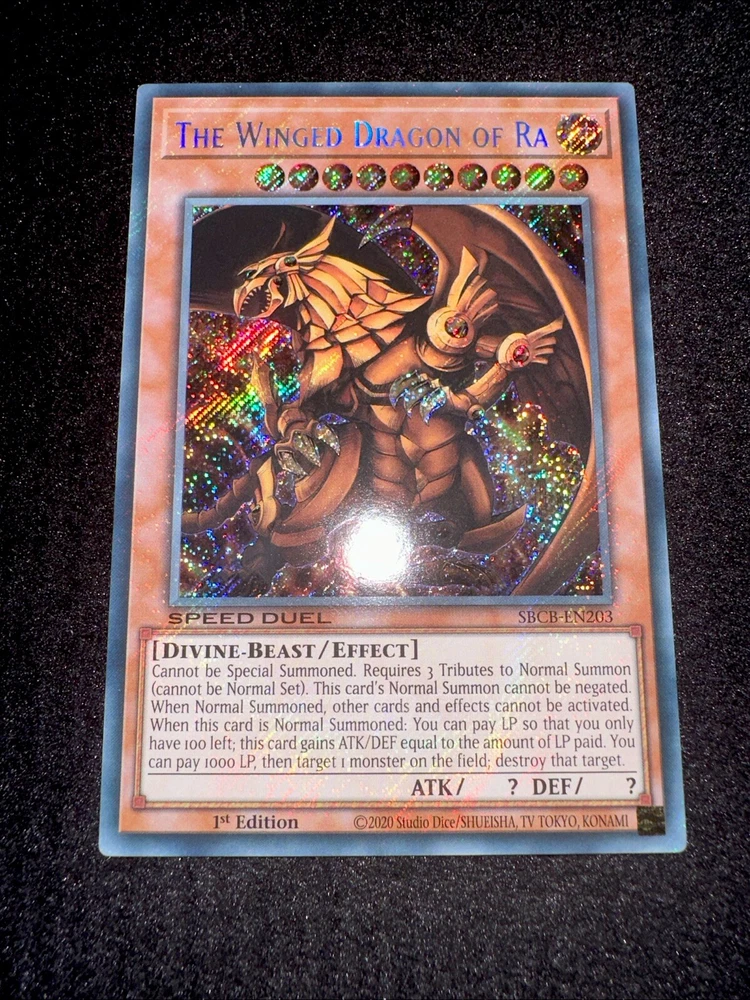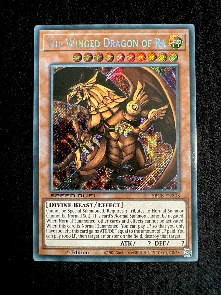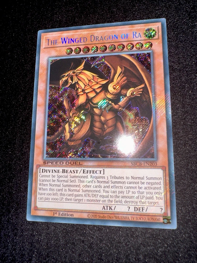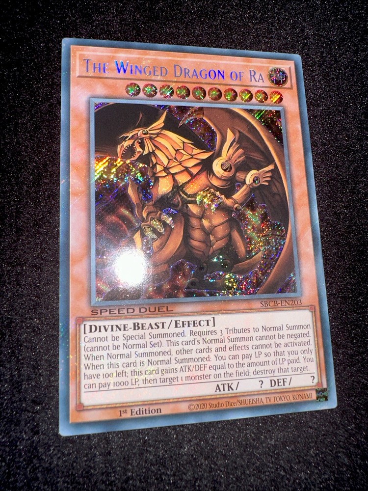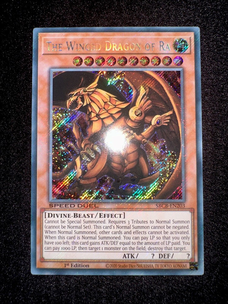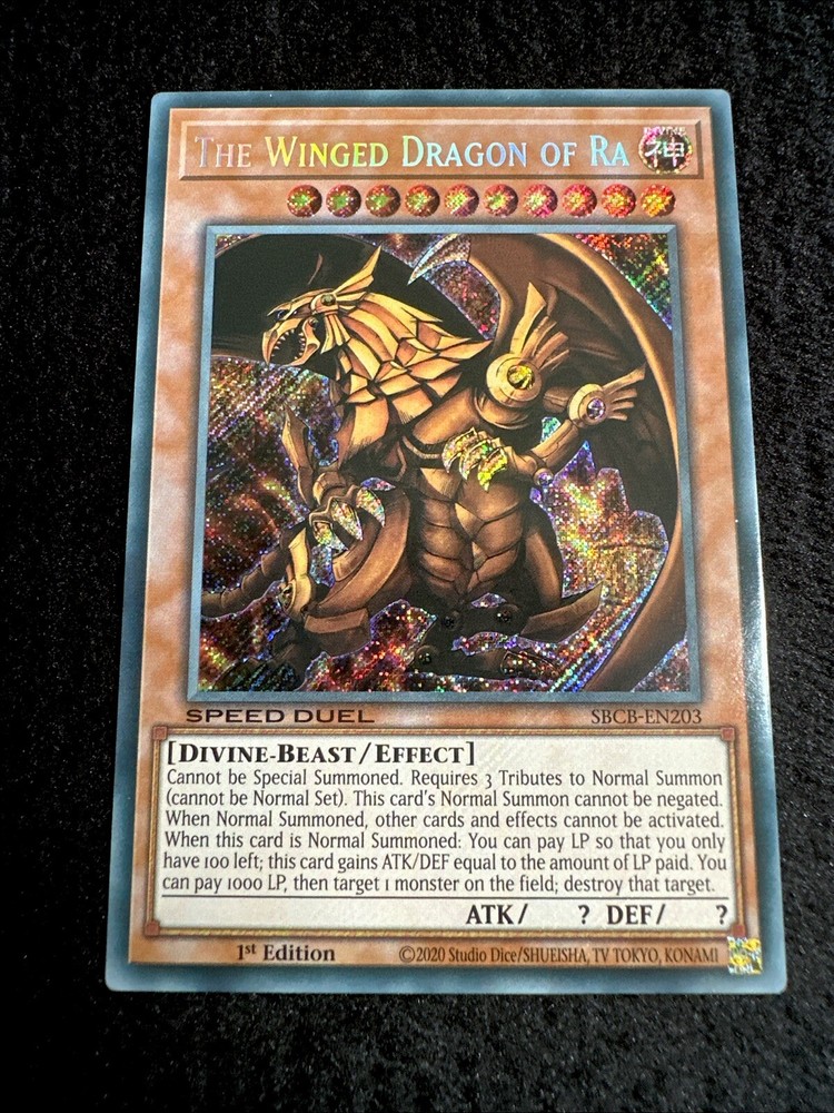 YUGIOH • THE WINGED DRAGON OF RA • SECRET RARE • SBCB-EN203 • 1st EDITION • NM Card Sleeve Included + Top Loader • Never Play Near Mint card • Authentic Konami USA Version YOU ARE GUARANTEED TO GET THE CARD NAMED IN THE TITLE. Thank you.
