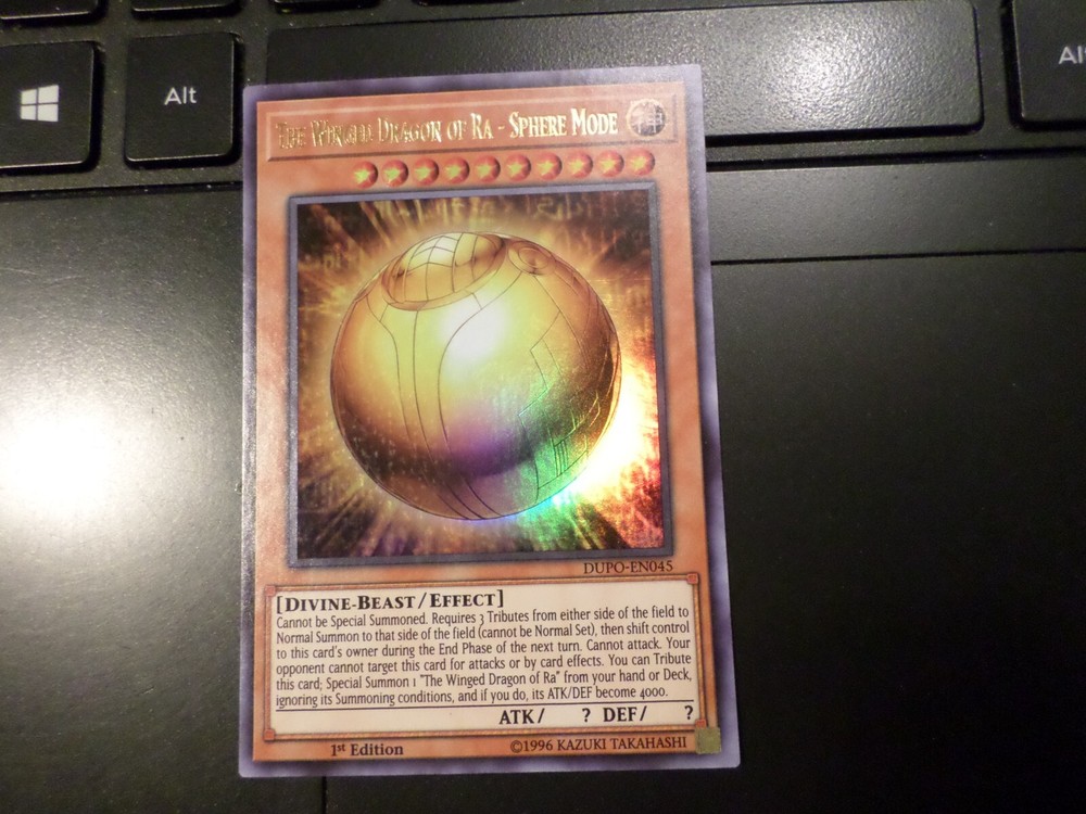 This listing is for ONE YUGIOH THE WINGED DRAGON OF RA - SPHERE MODE DUPO-EN045 1ST ED UR M/NM NEW Condition: M/NM Rarity: SCR - Secret Rare UR- Ultra Rare SR - Super Rare ULT - Ultimate Rare Near Mint (NM) Excellent to close to mint. Excellent (EX) Card may have minor edge wear / small dents more due to handling than to play. Lightly Played (LP) Card may have edge wear and/or small dents, but no major creases. Moderately Played (MP) Card may have visible creases, dents and/or edge wear. Heavily played (HP) Card will have noticeably damage such as large creases and/or heavy edge wear. Note: If edition of card(s) is not mentioned, it is for unlimited edition. Card(s) will be shipped with protective sleeve and in top loader Please note I am just a private collector, not a professional cards grader. Cards conditions are judged based on my personal opinions. Since I don’t price them based on professional standards in the market, please allow room for discrepancies. To ensure that your satisfaction is met with the highest standard, I usually pictured with actual card(s) – front and back unless there are multiple copies of the same card listed. Please feel free to contact me prior purchase if want to see more pictures or understand better of the card(s) conditions. All cards are guaranteed authentic. I don't take return unless item was incorrectly described/ reason due to my mistakes. I will try my best to rectify any problems or answer any questions that you may have. Please check your address to ensure it is complete and deliverable. Serious buyers only. Listing takes time and cost money. Please purchase/make offer when you are ready to pay/upon acceptance of offer. Thank you. ______________________________________________________________ Payment by Paypal Shipping & Handling is $2.95 to the U.S. Shipping to Canada is $3.95 and international is $6.95 for as many cards as you can purchase with combined shipment. Customs duties, if any, are for buyer's account. Tracking will be provided if available. When tracking is not offered, please strictly follow information in my shipment confirmation about expected arrival time or waiting period for claims. Please allow sufficient time for item(s) delivery and contact me first prior to opening any claims. I will provide proof of shipment upon request and money back guarantee if item doesn't show up after the waiting period. Thank you and appreciate your co-operation. Track Page Views With Auctiva's FREE Counter