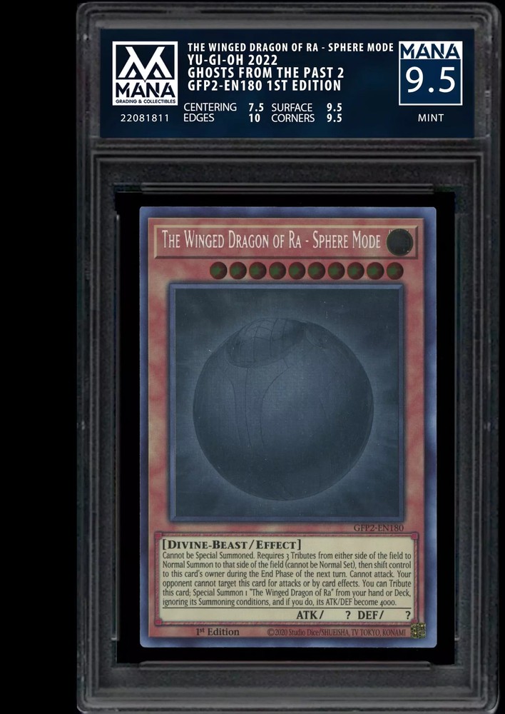 YU-GI-OH THE WINGED DRAGON OF RA - SPHERE MODE MANA 9.5 MINT -AI- "Mana Grading uses advanced diagnostics imaging tools backed by AI and professional graders to get incredibly accurate and quantifiable grading results Unlike other companies, Mana Grading measures the edges with extreme precision, finding perfect alignment almost never happens!! You can look this card up online in their online lookup to see an actual scan of the card along with all damage analysis! All grades are accurate! Sent fast and free in protective packaging! We have MANY unlisted cards that are graded, contact us for bulk or bundle deals!