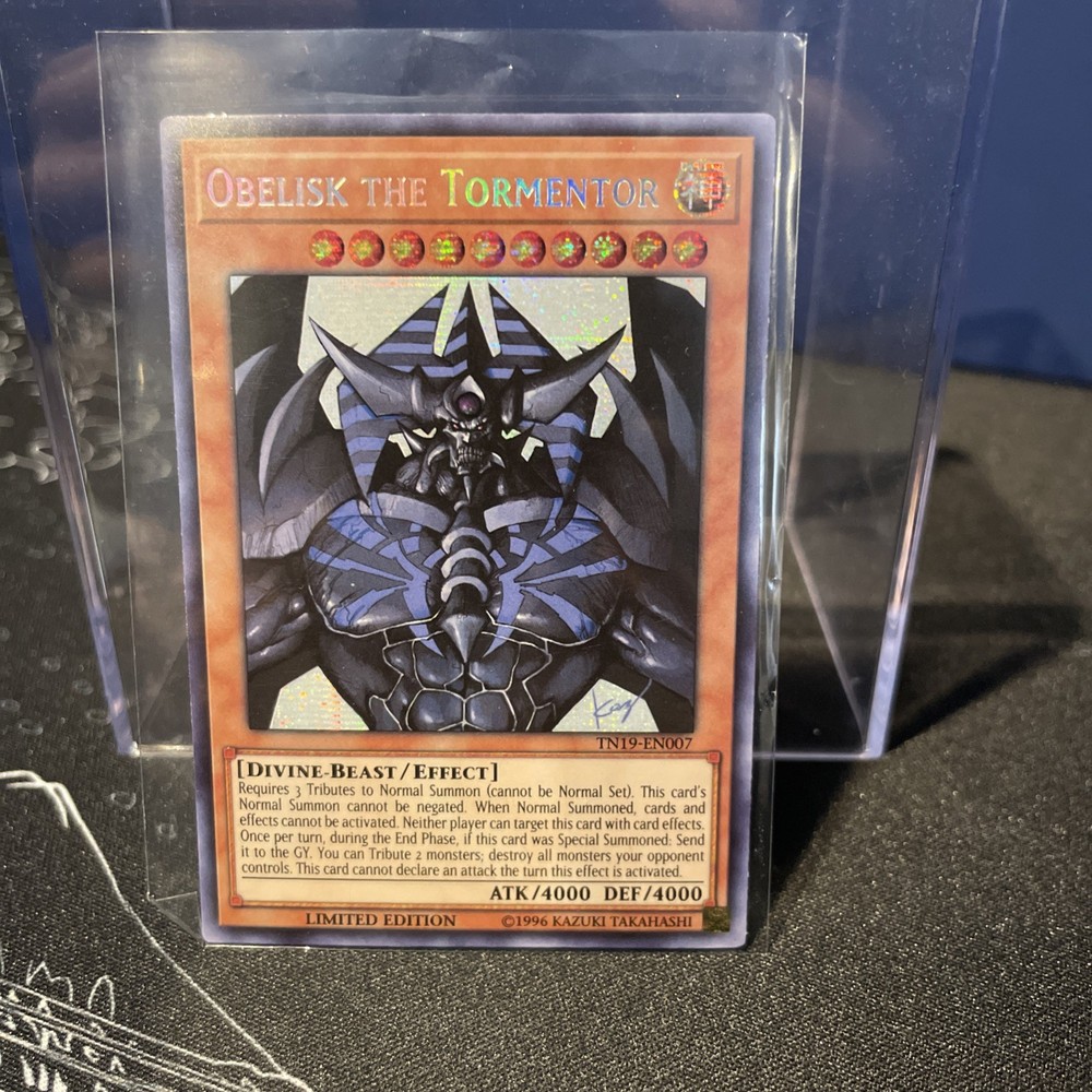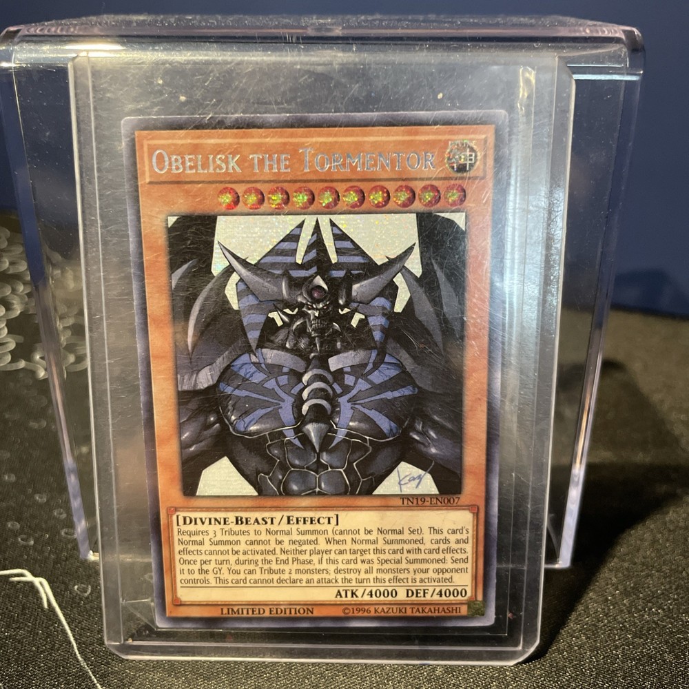 The product is a limited edition Yu-Gi-Oh! trading card featuring Obelisk The Tormentor with a prismatic finish. This collectible card is in near mint or better condition and is ideal for collectors or players of the Yu-Gi-Oh! TCG. The card is ungraded, making it a valuable addition to any card collection. With its unique design and limited availability, this card is sure to be sought after by fans of the game.
