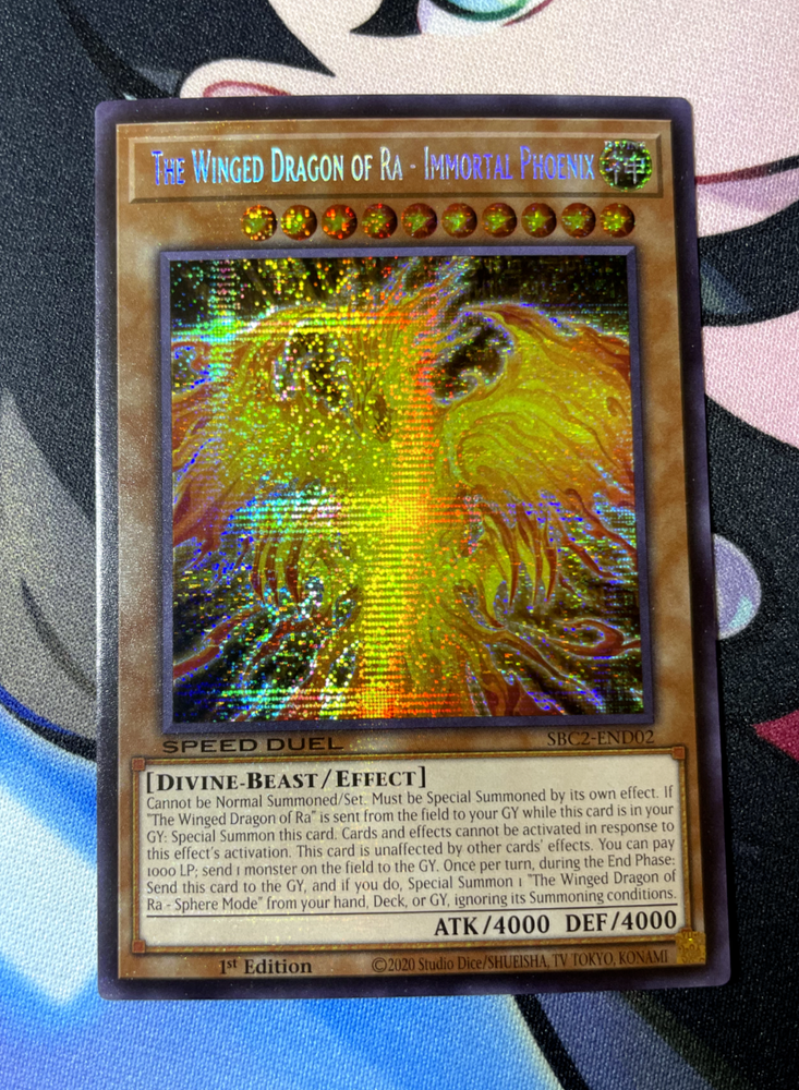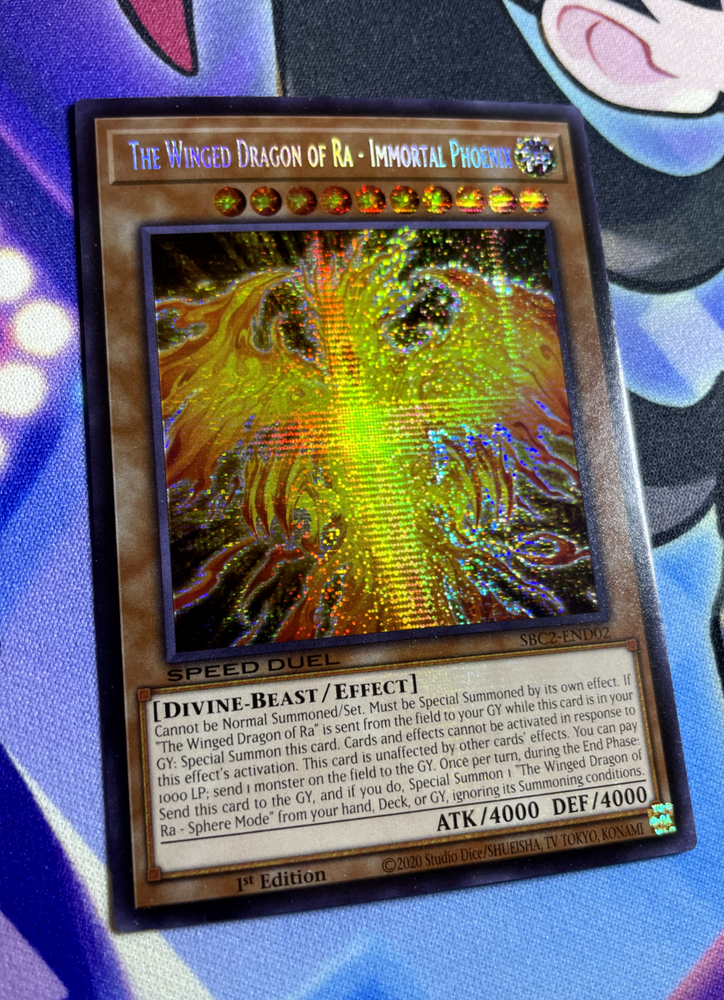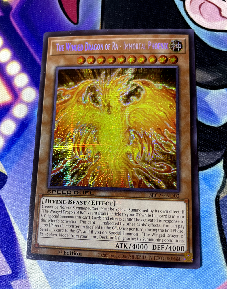 YUGIOH The Winged Dragon of Ra - Immortal Phoenix - SBC2-END02 SECRET RARE - 1st Ed - SPEED DUEL EXCELLENT CONDITION CARD! This card is a USA import. - It has been freshly pulled and sleeved. Any minor defect on the card is due to quality control issues and/or factory handling. If you have any questions, feel free to ask!