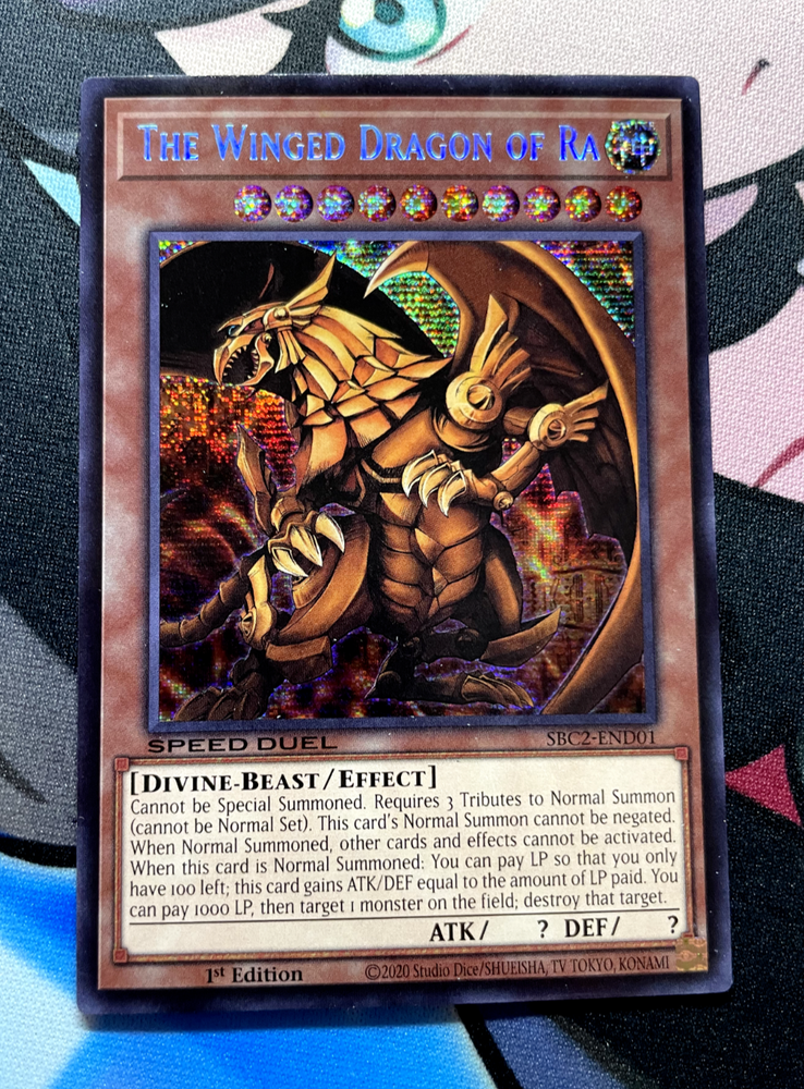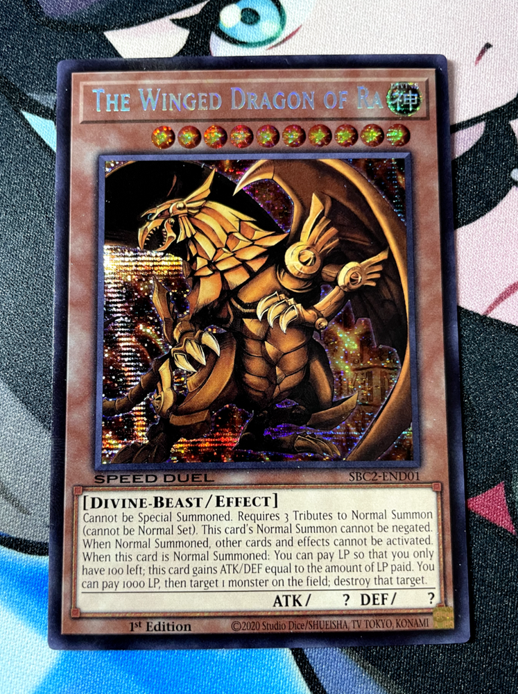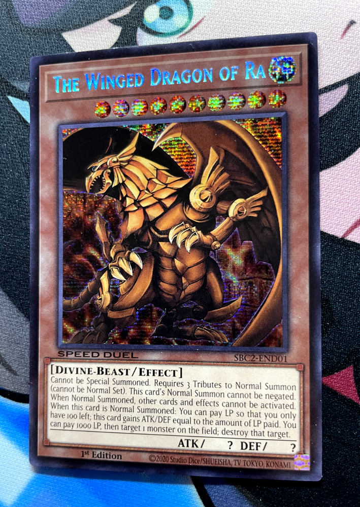 YUGIOH The Winged Dragon of Ra - SBC2-END01 - PRISMATIC SECRET RARE - 1st Edition - SPEED DUEL EXCELLENT CONDITION CARD! This card is a USA import. - It has been freshly pulled and sleeved. Any minor defect on the card is due to quality control issues and/or factory handling. If you have any questions, feel free to ask!