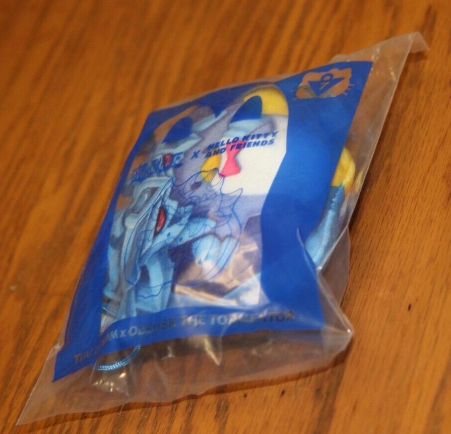 The product is a McDonald's Happy Meal toy collaboration between YU-GI-OH and Hello Kitty featuring Tuxedosam and Obelisk the Tormentor. This limited edition toy is part of the 2024 collection and is a crossover between the two popular character families.