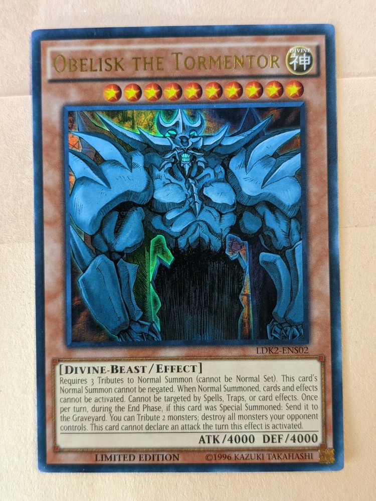 You are bidding on a YUGIOH-OBELISK THE TORMENTOR-LIMITED EDITION ULTRA RARE-LDK2-ENS02. This card is not graded but in good condition. The back edges are a little rough. You get the card shown in the pictures. I will ship your card in a top loader, bubble wrap then cardboard mailer. I will combine shipping. My shipping price is $2.99 for up to 9 regular thickness cards and $3.99 and up for anything over 10 cards. Payment must be made within 3 days of purchase. I will ship 2 business days after receiving payment. I don't ship on Saturday or Sundays. To ALL my customers, please be patient as the mail has slowed down due to the VIRUS. THANK YOU for your patience and understanding. Be safe!! There is a delay at customs, my US customers, please note it could take up to 60 days to receive your cards. If you have any questions, please don't hesitate to contact me. Please check out my other items at Jethro's cards and collectibles. Have a great day, cheers!