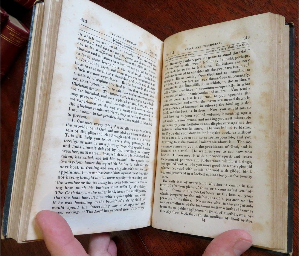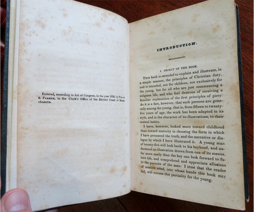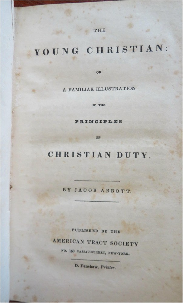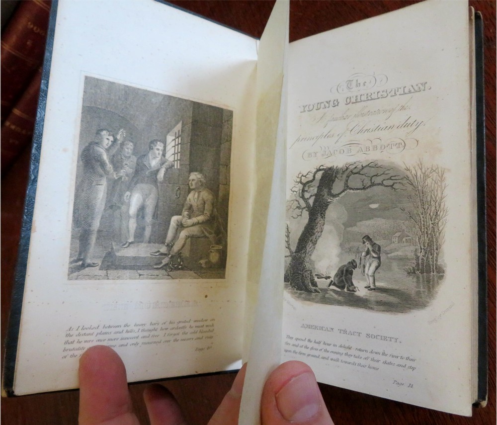 Young Christian Life Advice Christian Duty 1832 Jacob Abbott leather book Young Christian Life Advice Christian Duty 1832 Jacob Abbott leather book (Old Books, 19th Century Books, Leather Books, Religion, Christianity, Philosophy, Life Advice). The Young Christian: or A Familiar Illustration of the Principles of Christian Duty by Jacob Abbott. Published 1832, New York by American Tract Society. 395 pages. Text in English. Attractive antiquarian 1/4 leather binding, smooth spine, gilt bands, gilt title lettering. Book is physically old and shows some signs of handling and time. Binding gently age worn but still appealing, leather and joints slightly rubbed but still supple, remains overall very attractive as an object. Text block paper is gently age toned as typical, internally book remains mostly clean, tight and sound. A book which has been taken care of but may/ does not look like new. Still attractive on the shelf. Book displays a pleasing and unique age patina and is in rather nice antiquarian condition, any age flaws seem easy to overlook or forgive. Please review photos for more detailed attempt to present this book as it survives. We often over-describe any flaws that many sellers would not even bother to mention since most people would overlook them as minor and unworthy of comment. Many people tell us the books they receive from us are nicer in person than they appears on the screen. We want you to be clear about what you are buying, so we take numerous photos and try to describe it openly and honestly. Book Measures c. 7 1/4" H x 4 1/2" W. [B8924].