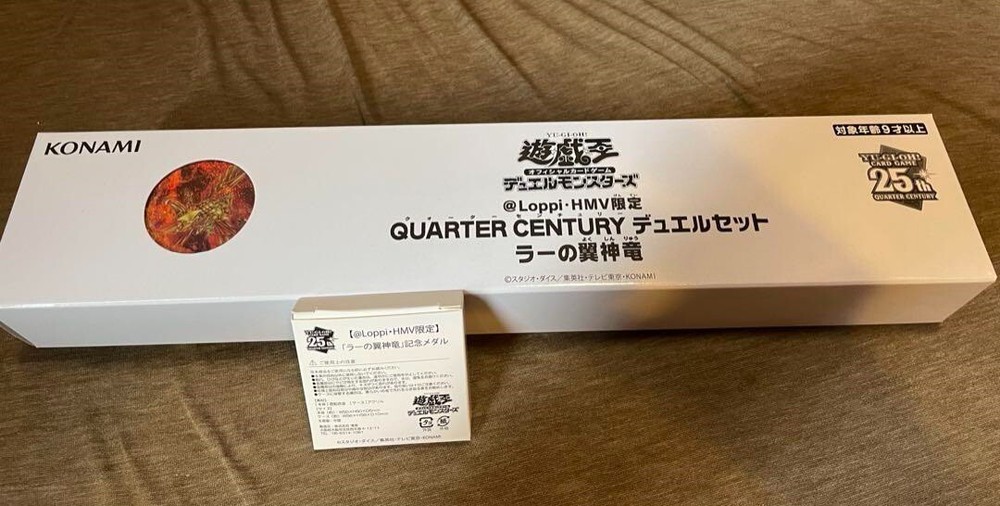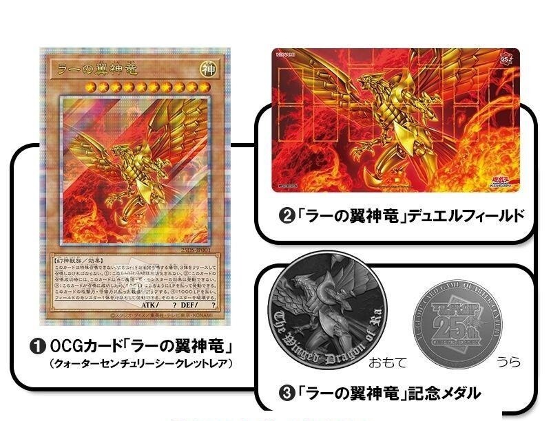 Description *CONTENTS 1.Special Duel Field 2 .Special card "The Winged Dragon of Ra" (Quarter Century Secret Rare) 3. The Winged Dragon of Ra Memorial medal *Brand : Konami * Language : Japanese *Condition :Brand NEW! (Factory Sealed) *It is 100% authentic Japanese product. (Not copy) Shipping USA Asia, Europe Australia South America Standard FREE! FREE! FREE! N/A Express US$15.00 US$15.00 US$25.00 N/A * Standard shipping : 7-14 business days. (with tracking number) *Express shipping (DHL / FedEx) : 2- 5 business days. (with tracking number) About Us *We sell more items. *If you bid multiple items,I combine shipping. Please check My STORE! Yu Gi Oh! item All My Store Items ! (All Store items)