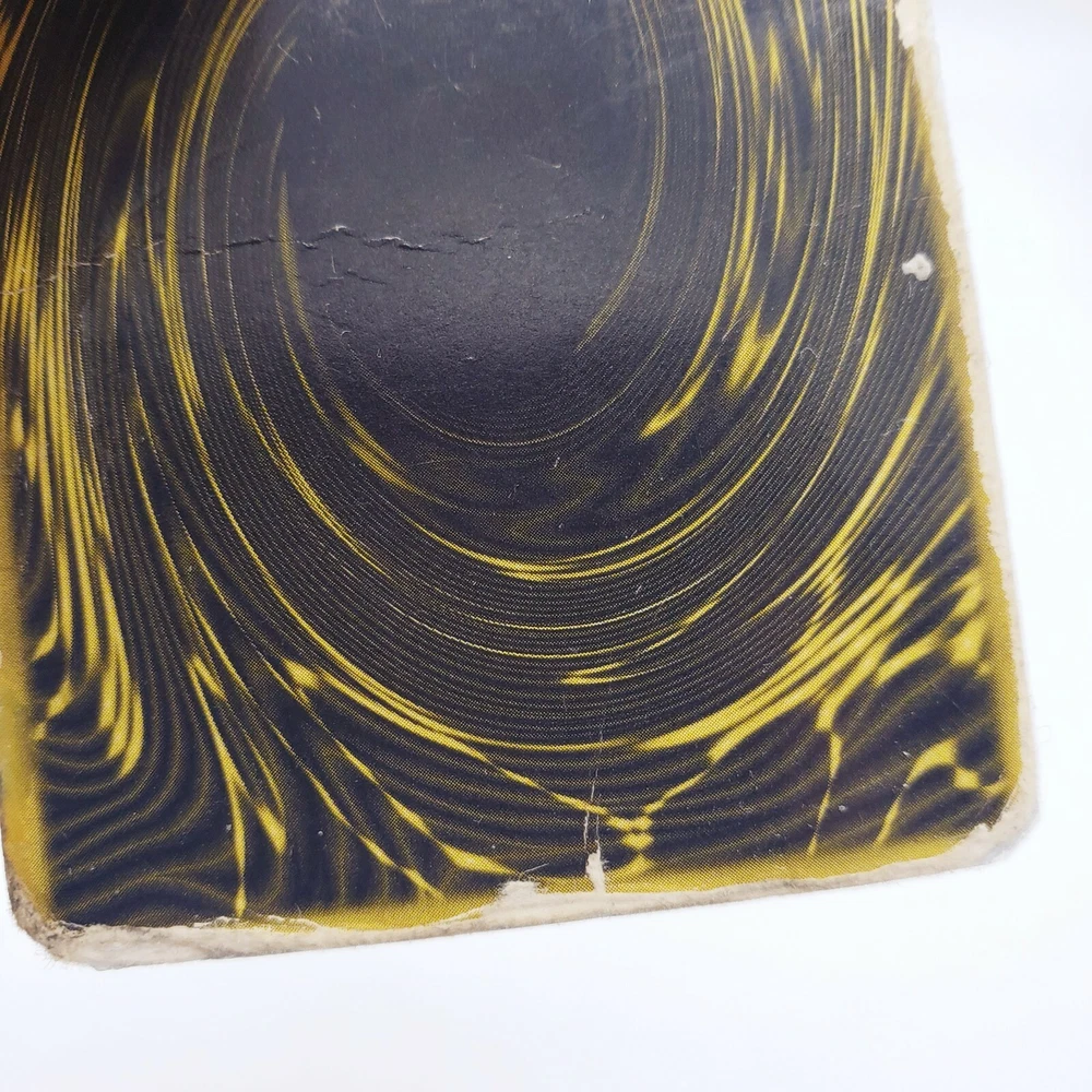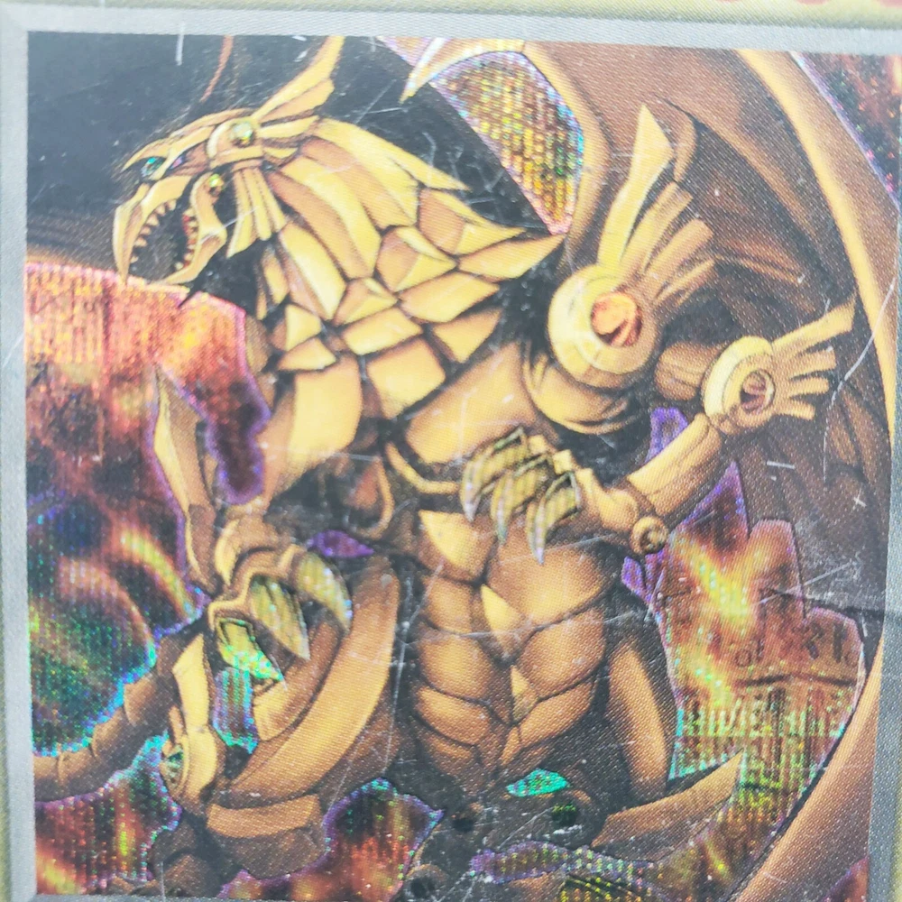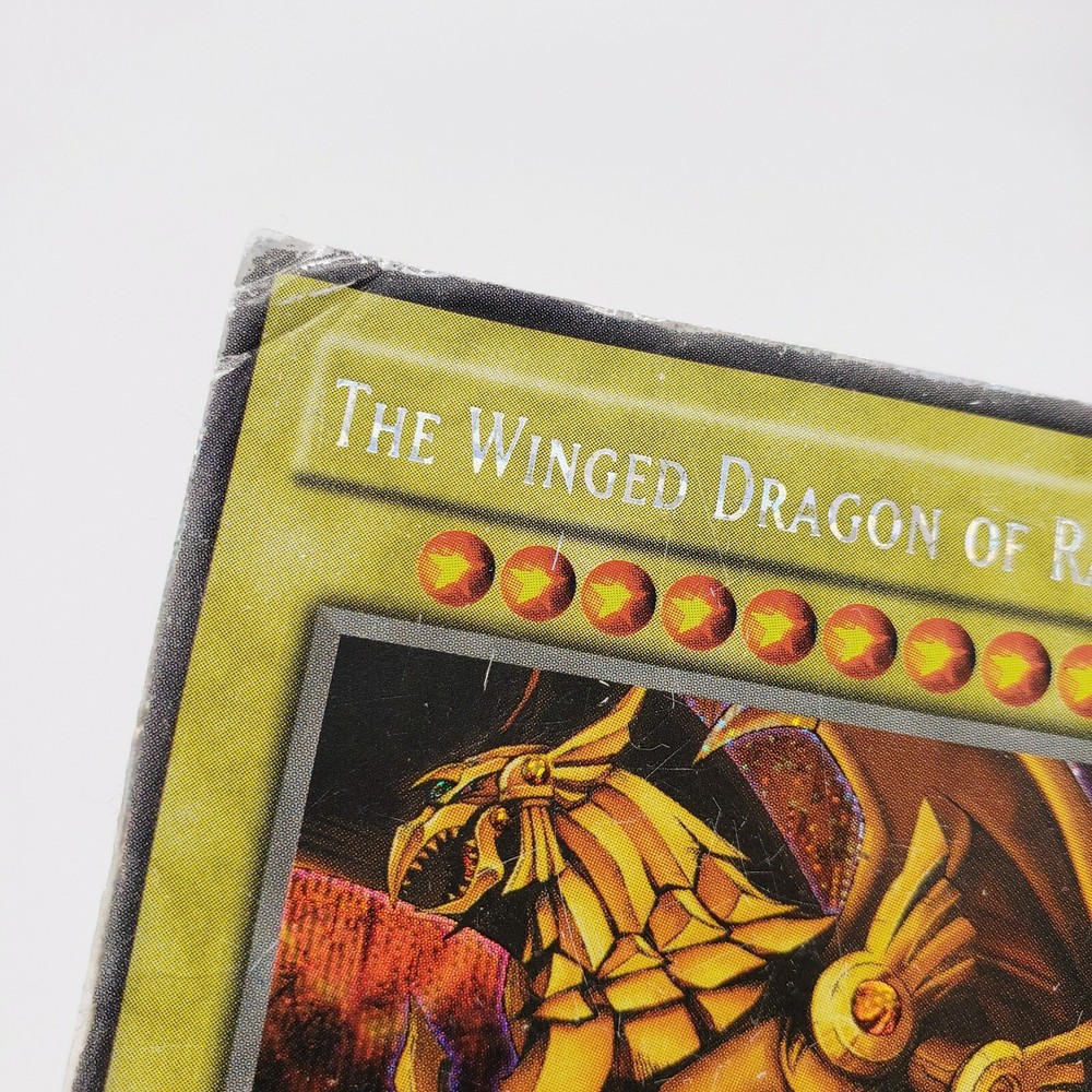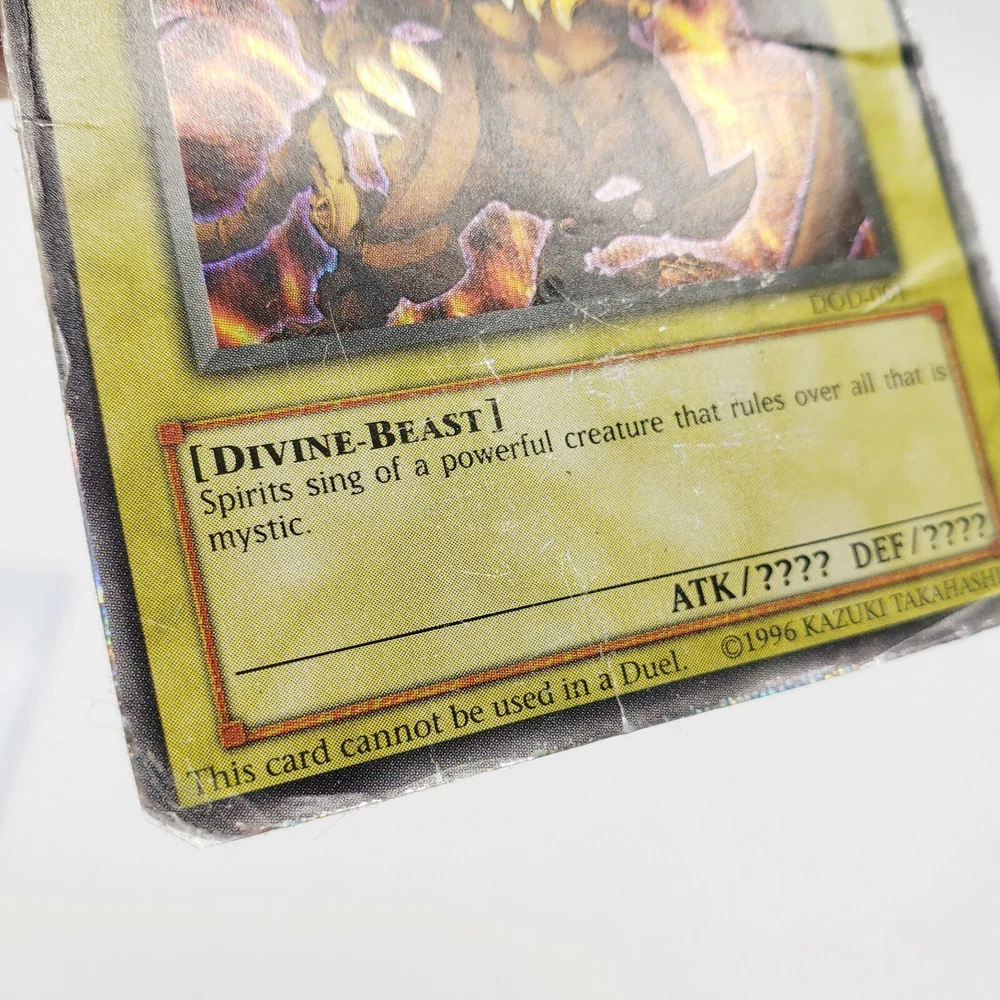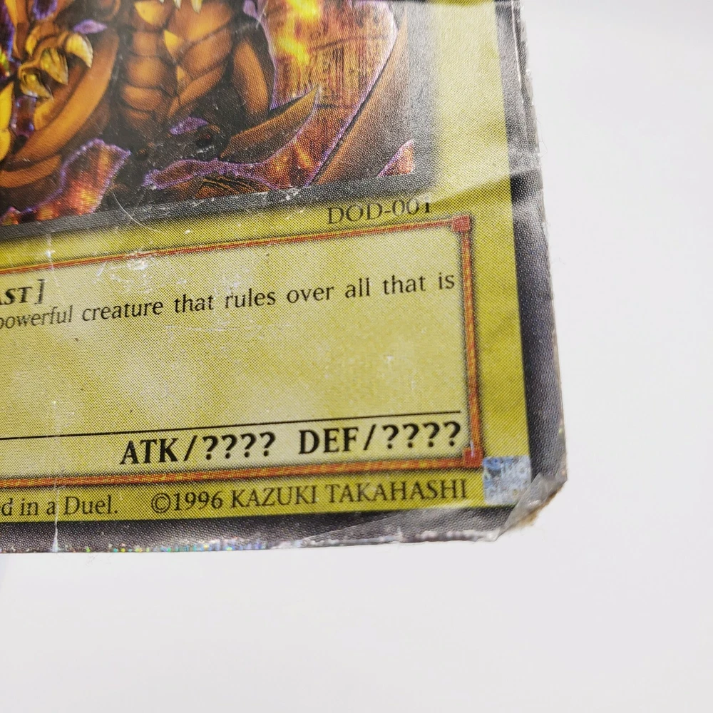 Vintage Konami 1996 Yu Gi Oh! The Winged Dragon Of Ra trading card game. A Secret Rare featuring holofoil/prism lettering and art. Hard to find, DOD-001.