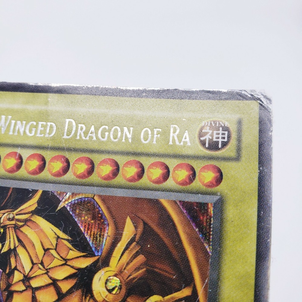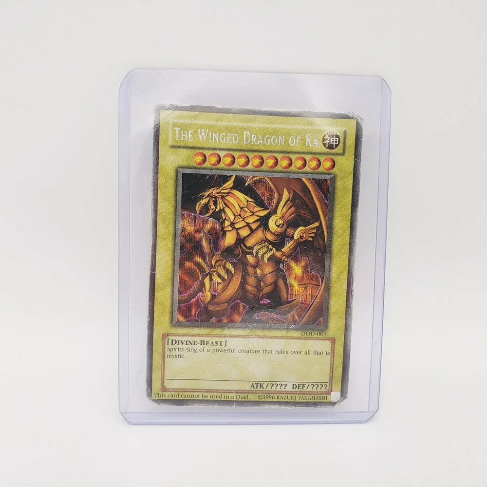Vintage Konami 1996 Yu Gi Oh! The Winged Dragon Of Ra trading card game. A Secret Rare featuring holofoil/prism lettering and art. Hard to find, DOD-001....