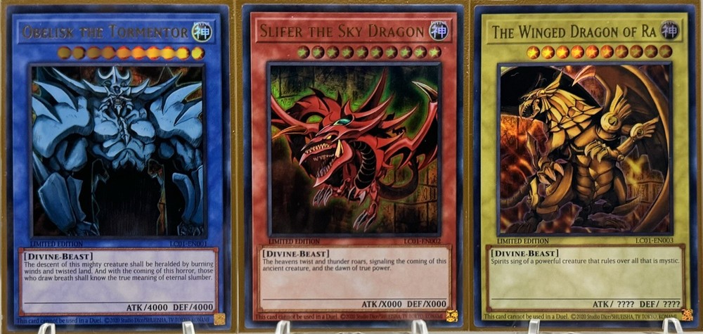 Unlock the power of the divine with this YuGiOh! 25th Anniversary Legendary Collection featuring the almighty Obelisk the Tormentor, Slifer the Sky Dragon, and Winged Dragon of Ra. These ultra rare, Japanese-sized cards boast a foil finish that will leave any collector in awe. The set includes LC01-EN001, LC01-EN002, and LC01-EN003, and is manufactured by Konami for English language play in the Yu-Gi-Oh! TCG.Summon the Divine-Beast creatures to your game with no age restrictions or vintage limitations. These cards are not autographed but offer an opportunity to add an impressive collection of divine creatures to any CCG individual cards or collectible card games collections. Choose to use them in game or display as a rare treasure. Don't miss your chance to own a piece of the power of the legendary Egyptian gods. - Card(s) comedouble-sleeved - Never played; packto sleeve - Near mint orbetter *Due tomultiple copies, the one(s) received may not match image* *Shipping costincludes packing supplies* - Color-codedsleeve(s) - Top loader - Cardboard sleeve - Stay flat Cardboard mailer