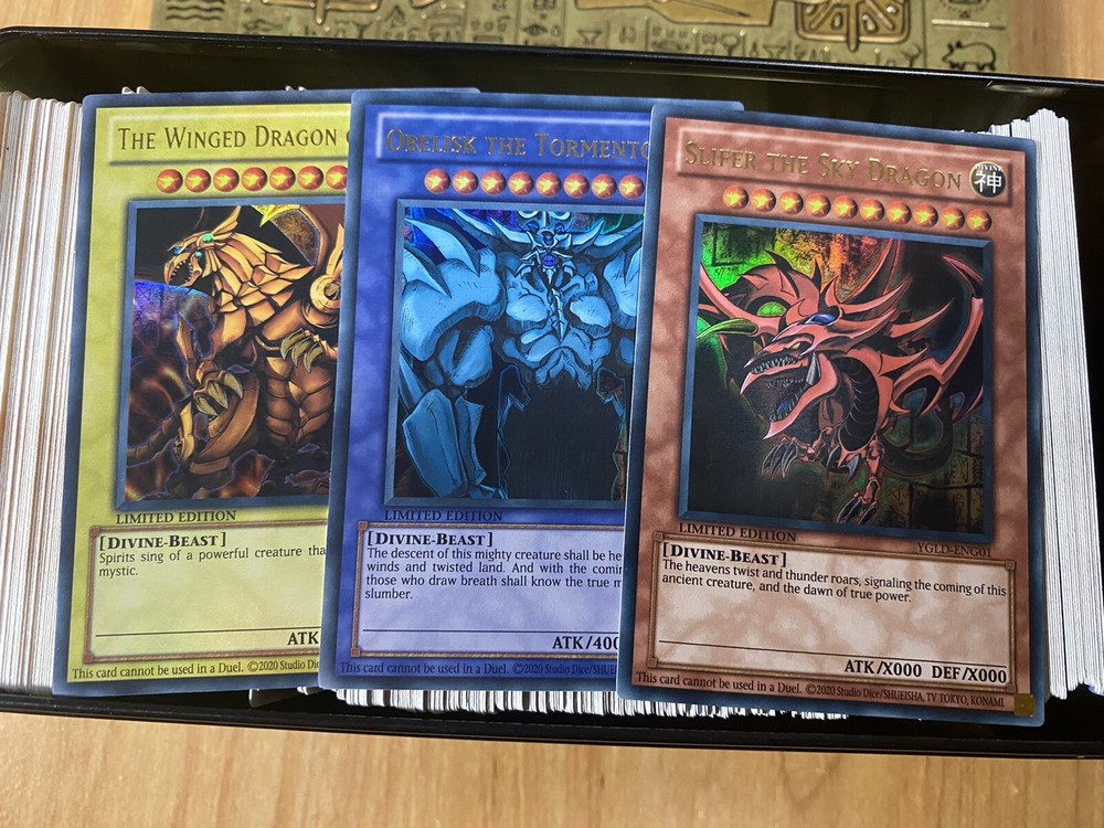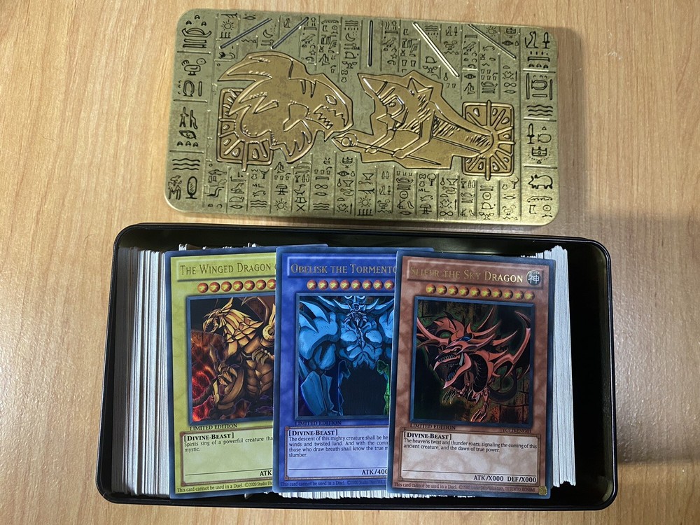 Yu-Gi-Oh! 500 Mixed Cards Lot With Rares & Commons W/ 2021 Tin Of Ancient Battles! ✔ Mint Condition ✔ Great Assortment ✔ Fast Shipping Each lot will include: 1x of each: ~~HOLOGRAPHIC ULTRA RARE~~ • Slifer The Sky Dragon YGLD-ENG01 • Obelisk The Tormentor YGLD-ENG02 • The Winged Dragon of Ra YGLD-ENG03 PLUS ~450 Common Cards ~50 Silver Letter Rare Cards 1 Holographic Super/Ultra/Secret Rare Card About the Cards Cards are randomly picked from a large stock, GOD CARDS ARE GUARANTEED IN EACH TIN! Cards will come from the newest expansion sets All Cards are in Mint to Near Mint condition Cards will be shipped in a 2021 Tin Of Ancient Battles Megatin! Shipping with delivery Confirmation within the US. Perfect as gift or party favors for any ages. Shipping and Handling: We ship all orders within 1 business day We typically ship via USPS First Class Packaging or USPS PRIORITY MAIL We package all our items carefully to ensure safety. Please contact us if you have questions about standards I usually ship out the same day, if not, the next day for sure. Payment is due immediately. The faster the payment the faster i'll ship out. Questions or comments?? Feel free to contact me. I'll get back to you within 24 hours. Check out my eBay store for more Yugioh items!