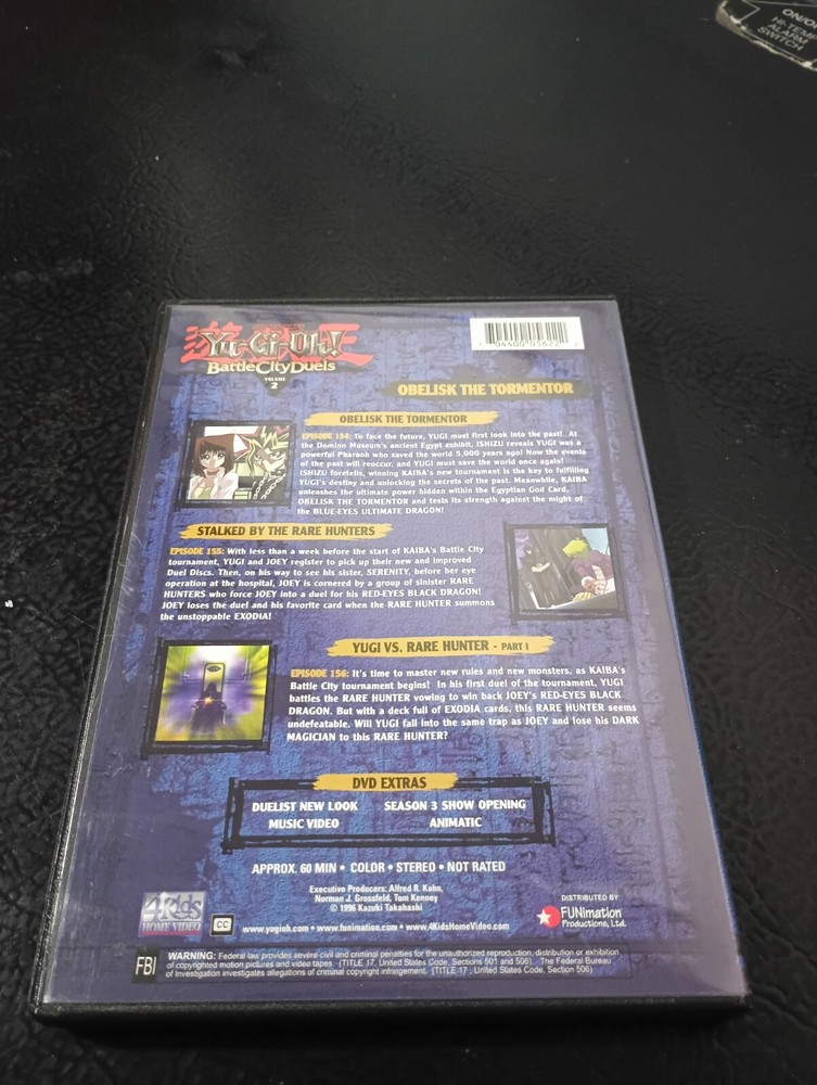 Yu-Gi-Oh! - Battle City Duels - Obelisk the Tormentor (Episodes 154-156) ---------------------------------------------------------------------------- The case is in Very Good to Like New condition. Most Box Sets have some minor shelf wear, so unless otherwise noted consider it it in Very Good to Like New condition. Assume that any/all digital copies or codes have expired and/or are not included. Please see pictures of the item to see exactly what you are bidding on. We do our best to accurately describe the condition and make the Buyer aware of any easily observable flaws with the items that we have in our store. If you have any questions about this item, please contact us before bidding or buying items. ---------------------------------------------------------------------------- ** Items Shipped USPS.