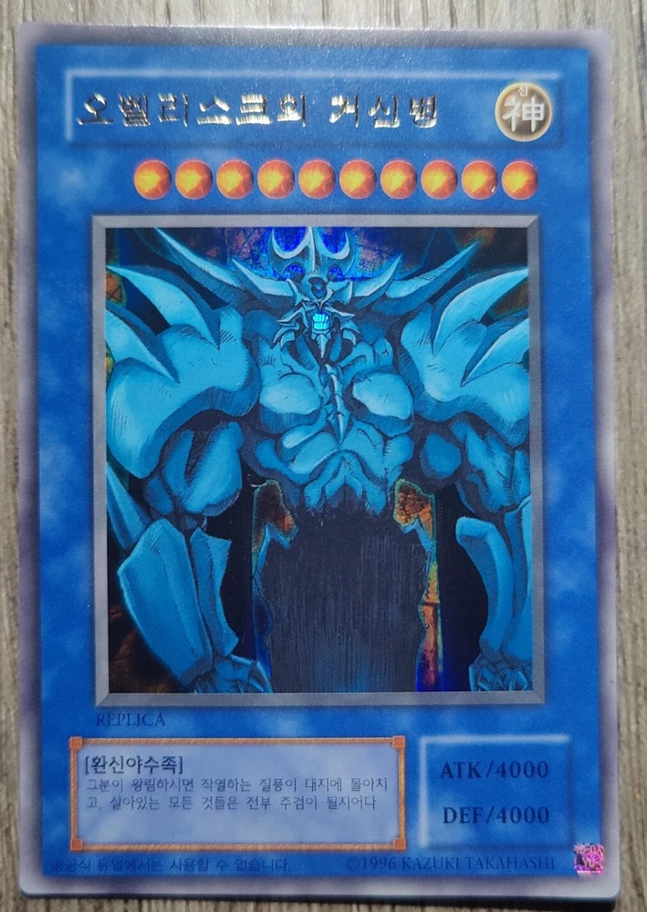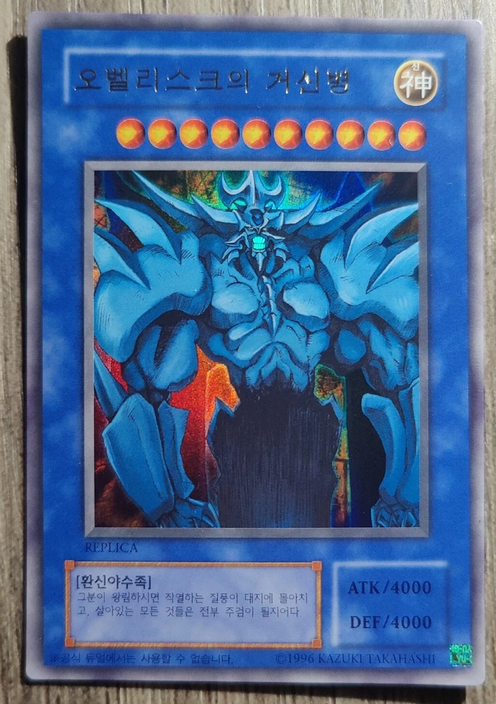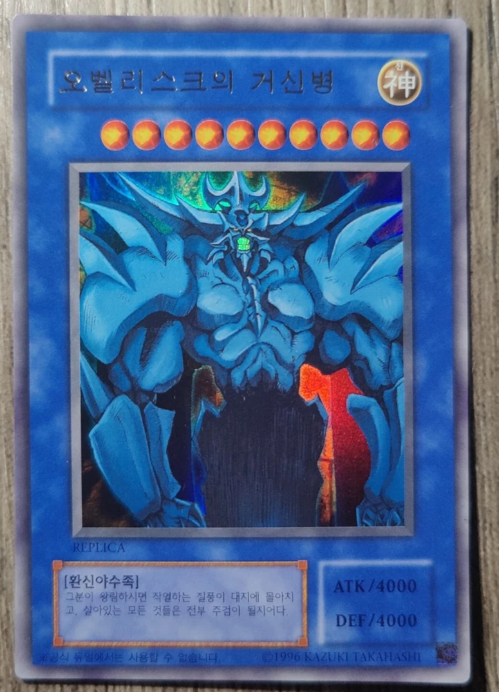 YuGiOh! Card "Obelisk the Tormentor" - ULTRA RARE MINT CONDITION! ABSOLUTELY GORGEOUS HOLOGRAPHIC CARD, PLEASE LOOK AT ALL PHOTOS IN THE LISTING! ABSOLUTELY A MUST HAVE card for all collectors! The card is in Mint / NM condition. Condition is New. Shipped with USPS First Class Package. 100% AUTHENTIC BUY WITH CONFIDENCE This card is in the Korean language. Please note that this is not the English version of the card. You will receive the card in the photos in my listing in a safe protective hard case. Thank you for looking at my listing.