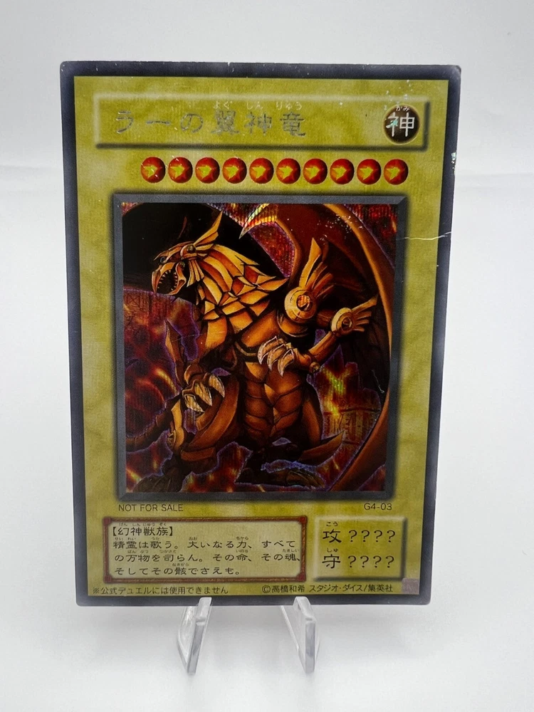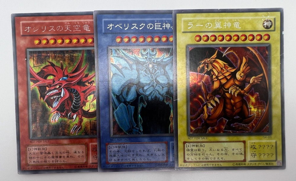 Yu-Gi-Oh! Card - Egyptian God Cards - Slifer Obelisk Ra G4 - Japanese. - - - Please consider following our Instagram where we post exclusive access to card’s not listed on this eBay. - - - INSTAGRAM —> PokeSellerKarl. FOR DISCOUNTS PLEASE MAKE OFFERS ON MULTIPLE CARDS. Free shipping offered as standard - Cards will be sent as letter packets and may take a short while to arrive. The Cards in the photo are almost certainly the cards sent. WE USE OUR OWN METHOD OF ASSESSING CARD CONDITION. PERFECT = PACK FRESH 101% NEW. EXCELLENT = NO NOTICABLE SCRATCHES OR WHITING. GOOD = SLIGHT WHITING OR SURFACE SCRATCHES. MODERATELY PLAYED = CONSIDERABLY WHITING AROUND THE EDGES OR SCRATCHED FRONT. DAMAGED = THE CARD IS DEAD AF OR HAS A FOLD. Additional Policies. Returns are accepted for 30 days after receiving the item. Please message us before you making the return shipment back to me. The buyer is responsible for covering shipment fee’s when returning the item. We reserve the right to cancel based on Japan Post being AWFUL and stopping delivery to certain countries for no reason. Not our fault. Japan Post sucks. Thank you for using KarlSellsThings. We appreciate you guys so much. If you’ve read this far, just know that by buying this card you are funding a happy Karl, a happy wife, and fueling my love for coffee that then fuels me to further hunt down cards for you guys. Thank you. If you read this far….Oi thanks. Thank you. Gracie Mille. Danke Sehr. Merci. Spasiba. Salamat. Дякую.
