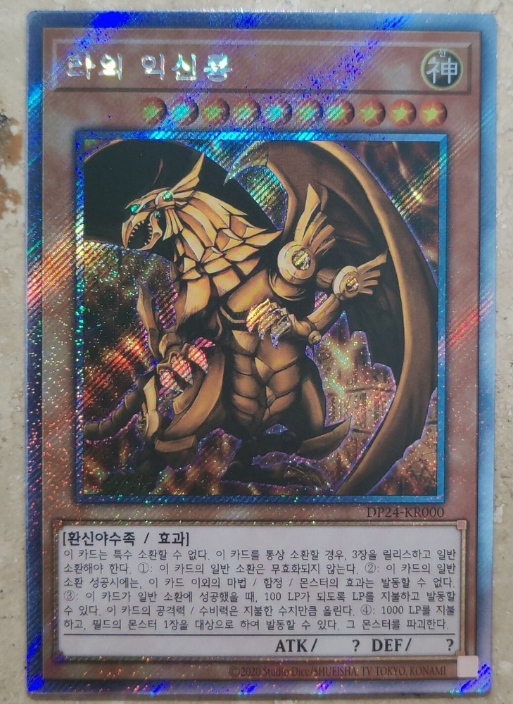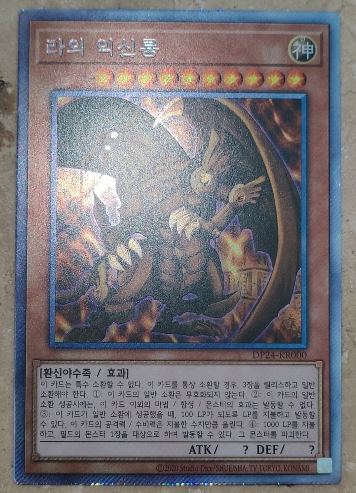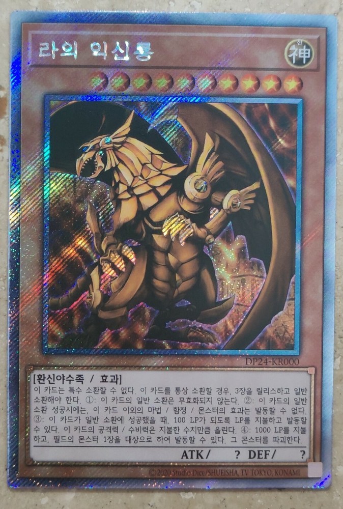 YuGiOh! Card "The Winged Dragon of Ra" - EXTRA SECRET PRISMATIC RARE - MINT ABSOLUTELY STUNNING HOLOGRAPHIC PATTERN ON THIS CARD, PLEASE LOOK AT ALL PHOTOS IN THE LISTING! ABSOLUTELY A MUST HAVE card for all collectors! The card is in Mint / NM condition. Condition is New. Shipped with USPS First Class Package. 100% AUTHENTIC BUY WITH CONFIDENCE This card is in the Korean language. Please note that this is not the English version of the card. You will receive the card in the photos in my listing in a safe protective hard case. Thank you for looking at my listing.