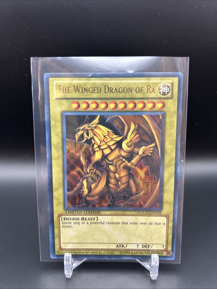 Unleash the power of ancient Egypt with "The Winged Dragon of Ra" from the legendary "- Yugi -" set, a must-have for any Yu-Gi-Oh! TCG enthusiast. This ultra rare holo card, YGLD-ENG03, boasts an eye-catching holographic finish that will shimmer in the light as you dominate the battlefield. Crafted with precision by Konami, this iconic card is not only a force in gameplay but also a prized collectible for fans of the series. Enhance your deck or display it with pride; "The Winged Dragon of Ra" is a timeless addition to any Yu-Gi-Oh! collection. I am planning to ship card via plain white envelope. I am happy to upgrade shipping to bubble mailer at buyer request and additional payment.