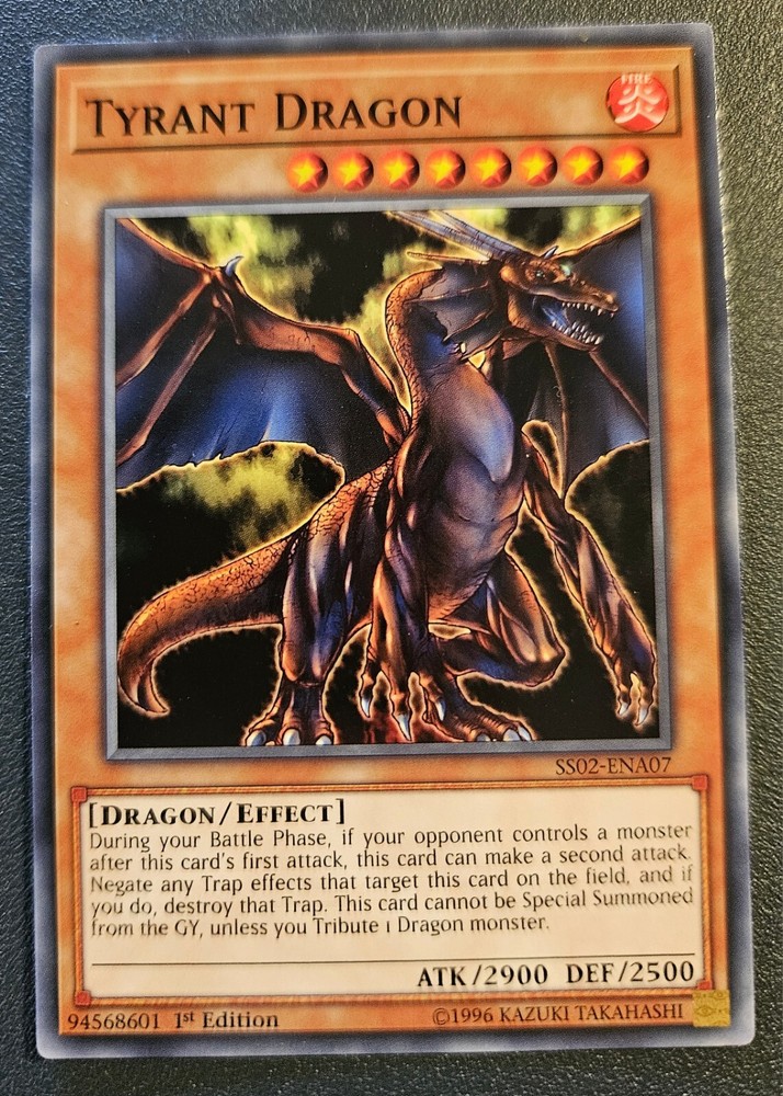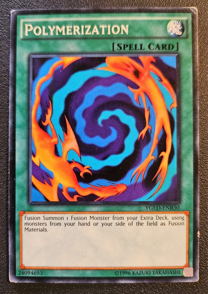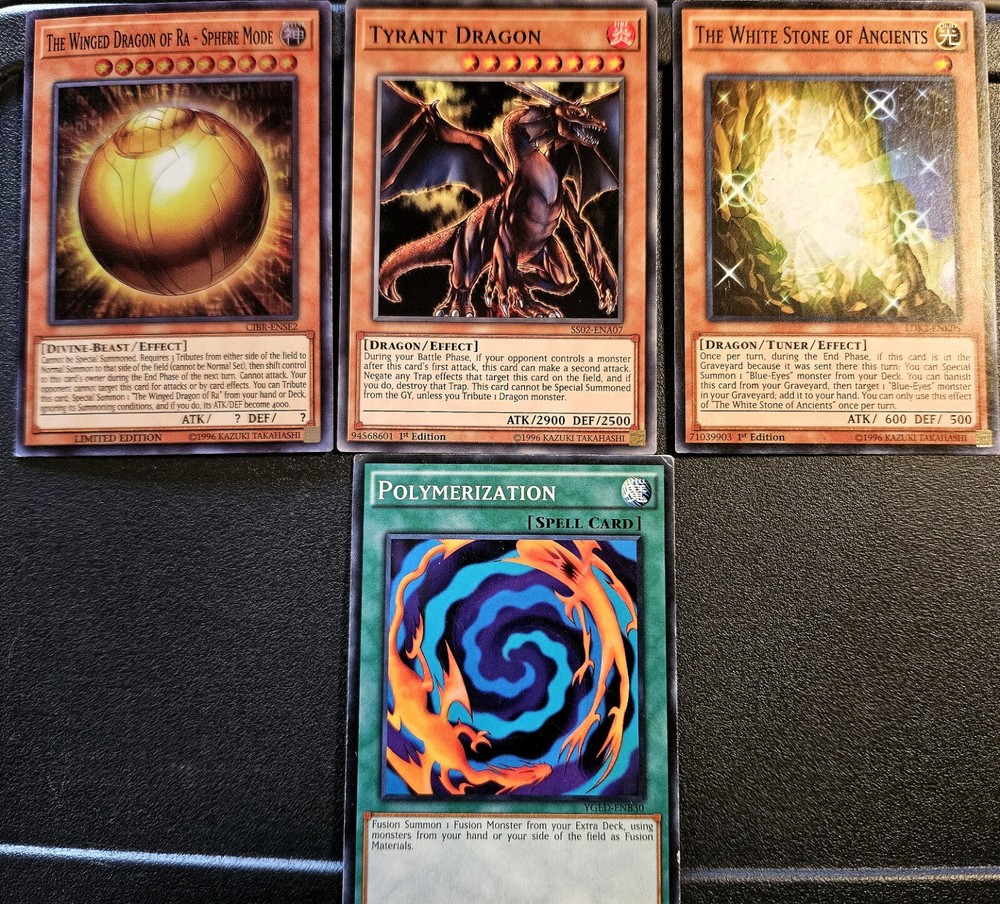 This Yu-Gi-Oh card lot includes 4 cards from the 1996 set, featuring popular characters like Polymerization, The White Stone of Ancients, Tyrant Dragon, and The Winged Dragon of Ra-Sphere Mode. The cards come in standard size with a mix of regular and foil finishes and belong to different categories like divine-beast, effect, dragon, and tuner. The cards are in excellent condition and have been lightly played. They also come with features like limited edition, unlimited, and 1st edition. This lot is perfect for collectors of Yu-Gi-Oh! TCG and is manufactured by Konami in English language. These cards will come in individual card sleeves. Polymerization has minor damage on the corner as pictured.