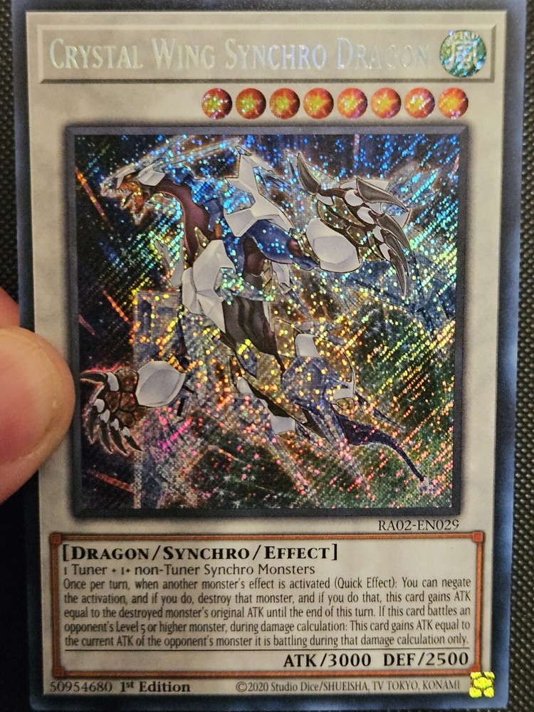 This rare and highly sought-after Yu-Gi-Oh! card features the Crystal Wing Synchro Dragon in stunning Secret Rare quality. With a beautiful foil finish and 1st Edition status, this card is a must-have for any serious collector. The card number is RA02-EN029 and it is part of the 25th Anniversary Rarity Collection II set. The card is in excellent shape and has been well-maintained, ready for display or use in your Yu-Gi-Oh! TCG games. It is in English language and manufactured by Konami. Don't miss your chance to add this amazing card to your collection!
