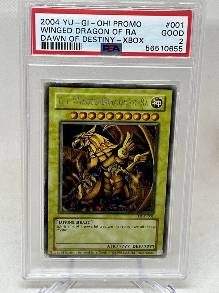 Experience the thrill of owning a rare and highly sought-after card with this Yu-Gi-Oh! Dawn of Destiny The Winged Dragon of Ra DOD-001 PSA 2 XBOX FAST SHIP. This card is a must-have for any collector or player of the Yu-Gi-Oh! TCG. With its stunning design and powerful abilities, it is sure to impress. The card features the popular character Dawn and is manufactured by Konami. It is part of the Xbox Dawn of Destiny set and is a Secret Rare card. The Winged Dragon of Ra is a Monster Card with the card type being Promo. This card is in English language and is perfect for those who want to add an exceptional card to their collection.