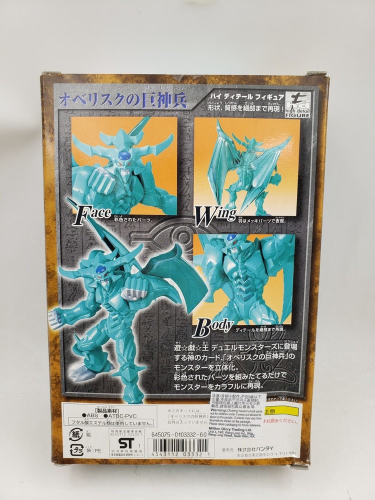 Yu-Gi-Oh Duel Monster Hight Detail Figure Series No. 3 The God of Obelisk The Tormentor Figure Kit Bandai Japan Item description: Size: Non Scale Figure Kit, Box about 22 x 15.1 x 5cm. Manufacturer: Japan Bandai (2001) Condition: New, C8 Box, Box have Scratch and Dent on it, Box Never Opened!!!!!!!! Please refer to the photo!!!!!!!!!! What you See is What you GET!!! Please Understand the Item Condition and Refer to the photo Before you Purchase this item, Thank you!!!!!!!!!!! Collectible item. Rare in Market!!!!!!!!!!!!!!! Payment method: We accept Paypal only . Please clear payment within 4 days for completion of transaction. Non-payment will lead to negative feedback and non-payment file in eBay. Please be sure that your shipping address registered in Paypal is correct. International Buyers - Please Note: Import duties, taxes and charges are not included in the item price or shipping charges. These charges are the buyer's responsibility. Please check with your country's customs office to determine what these additional costs will be prior to bidding/buying These charges are normally collected by the delivering freight (shipping) company or when you pick the item up - do not confuse them for additional shipment charges. We do not mark merchandise values below value or mark item as "gifts" - US and International government regulations prohibit such behavior. Shipping and handling: We offer international shipping only (Local buyers have to pay the same postage) Items will be shipped within 2 days after the payment is clear. Shipping includes tracking numbers. Items usually takes 14-21 Business days for delivery. ( South America , Mexico and Africa Usually Takes 4-6 Weeks for Delivery Time.) (The exact delivery time Can Varies will be affected by Bad Weather, Limit Cargo, Peak Season and Customs Clearance ) Return Policy: Returns are accepted ; Please contact us within 30 days of delivery if there are any problems with your item. Support may not be available after 30 days have passed. Parcels returned to the sender will be subject to Airmail redelivery fees. Postage fees are non-refundable. Parcels deliberately returned by the customer without our authorization will be refunded minus postage fees and the customer will be blocked from making future purchases at our store. If you have any question, please feel free to contact us!!!!