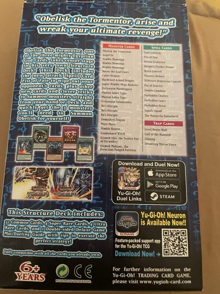 This is a 1st Edition Sealed Yu-Gi-Oh! Egyptian God Deck featuring Obelisk the Tormentor from Konami. The deck is a Structure Deck in English language and was manufactured in 2020. It is a part of the Yu-Gi-Oh! TCG and is ideal for collectors or players looking to enhance their deck with the powerful Obelisk the Tormentor card. The deck provides a ready-to-play configuration for fans of the game to enjoy.