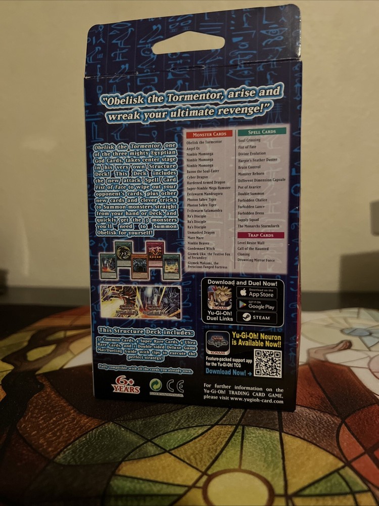 The product is a Yu-Gi-Oh Egyptian God Deck Structure Deck featuring Obelisk The Tormentor, associated with characters Seto Kaiba and Yugi Muto. It includes Egyptian God Cards, is made of card stock, and has a Regular and Holo finish. The deck is part of the - Yugi - set and is manufactured by Konami in the United States. It is suitable for ages 8 and up and is in English language.