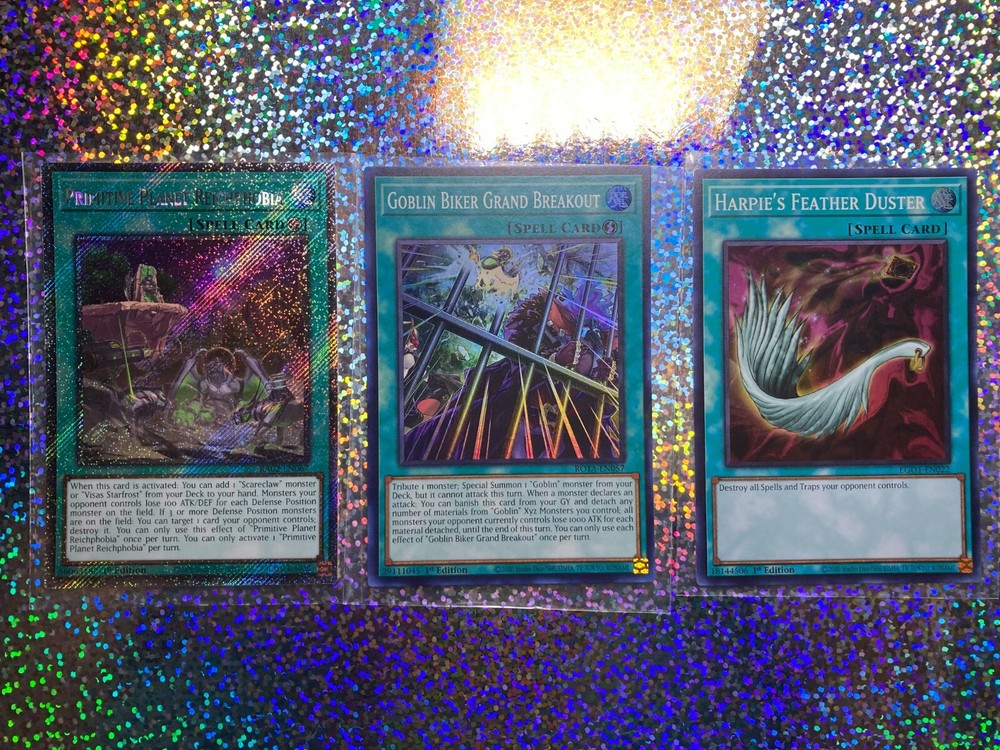 Save money with this custom bundle and cheap shipping. Item Description This custom bundle includes three (3 ) Yu-Gi-Oh! cards in "Lightly Played" (aka "LP" or "Excellent") condition. It may have moderate whitening/chipping on its corners and edges; moderate surface indentations, scratches/scuffing; and minor creases, discoloration, and staining: Main product (detailed under "item specifics"): One (1) 2021 1st Edition Egyptian God Deck: Obelisk the Tormentor Super Rare EGO1-EN022 Harpie's Feather Duster . Additional product (not detailed under "item specifics"): One (1) 2024 1st Edition Rage of the Abyss Super Rare ROTA-EN057 Goblin Biker Grand Breakout . One (1) 2024 1st Edition 25th Anniversary Rarity Collection II Platinum Secret Rare RA02-EN067 Primitive Planet Reichphobia . For clarification, this is not a random mixed card lot. You will receive the exact cards shown in the images provided in this listing. These cards are stored in a pet and smoke-free location with an archival-quality card sleeve. Tip: The most significant flaw anchors the overall condition, and the manufacture recommends this product to kids ages 8+. If you have any questions, please feel free to contact me anytime. Shipping and Handling Your order will ship in a semi-rigid card holder and protective bag (to meet strict requirements) via eBay Standard Envelope (a USPS First-Class Mail service for a standard white envelope ) within one business day of receiving payment. This service can only be tracked in your eBay account. Because this service is limited to envelopes that are 1/4 of an inch or thinner, orders exceeding this amount will ship in more than one envelope. I reserve the right to upgrade your shipping service as needed. I offer a shipping discount for listings with a shipping charge if you pay for all of these listings in one transaction. Please refer to the "Shipping" tab to evaluate the base shipping charge and this discount. Payments Please complete the transaction within 5 days of committing to purchase this item. For a list of payment methods that eBay accepts, please refer to "payment details." Returns You may return every item from this listing within 30 days of delivery to receive a refund based on your Bid or Buy It Now price. Please note that shipping and handling charges are not refundable, and the buyer is responsible for all return shipping and handling expenses. Thank you for viewing this listing.