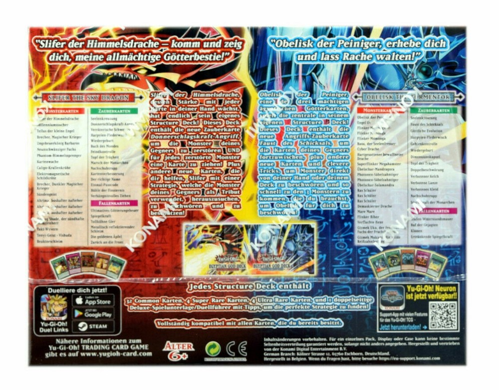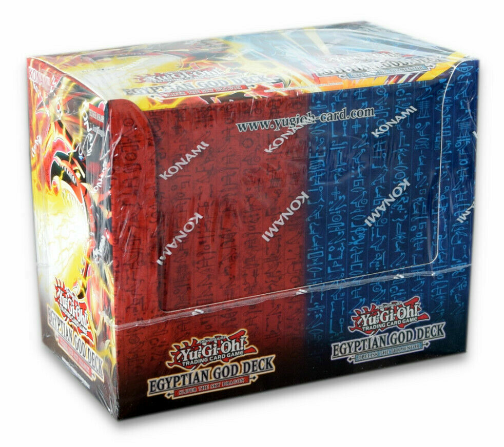 YuGiOh Egyptian God Decks This listing is for x8 factory sealed Yugioh Structure Decks Slifer the Sky Dragon Structure Deck 1st Edition x4 decks Obelisk the Tormentor Structure Deck 1st Edition x4 decks Awaken the power of the Egyptian God Cards! If you've ever wanted to build a Deck around an Egyptian God Card but didn't know where to start, look no further than the Egyptian God Decks! Egyptian God Deck: Slifer the Sky Dragon and Egyptian God Deck: Obelisk the Tormentor serve up simple strategies to Summon and win with either Slifer the Sky Dragon or Obelisk the Tormentor. Each Egyptian God Deck contains 40 cards: 4 Ultra Rares, 4 Super Rares, 32 Commons, 1 Deluxe Game Mat/Dueling Guide. Set includes: 1x Egyptian God Deck Slifer the Sky Dragon, 1x Egyptian God Deck Obelisk the Tormentor. Have fun and enjoy