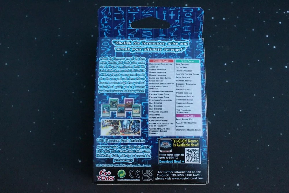 Yu-Gi-Oh! - Egyptian God Obelisk The Tormentor Structure Deck • Pick up both Egyptian God Decks so you can mix and match their strategies to create an awesome deck that can wield multiple Egyptian God Cards. • Each deck contains 40 cards: 34 common, 4 super rare and 4 ultra rare. • Decks also include a play mat and a Dueling guide. Contents: • 1 x Game Mat/Dueling Guide • 40 x Cards