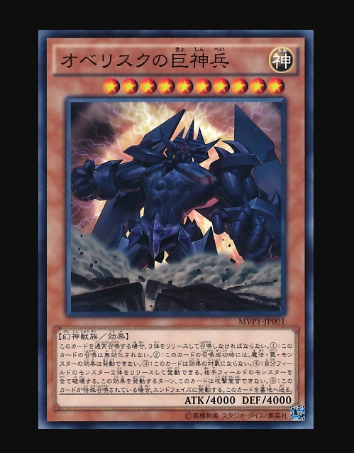 You will receive the following item/s: Card Name: YuGiOh MVPY-JP001 Obelisk the Tormentor Japanese Card Code: MVPY-JP001 Condition: Sealed Shipping and Other Details Shipping to WORLDWIDE : $10.00 Additional items: $0.50 Registered Mailing Charge: $2.50 (Request after purchase)