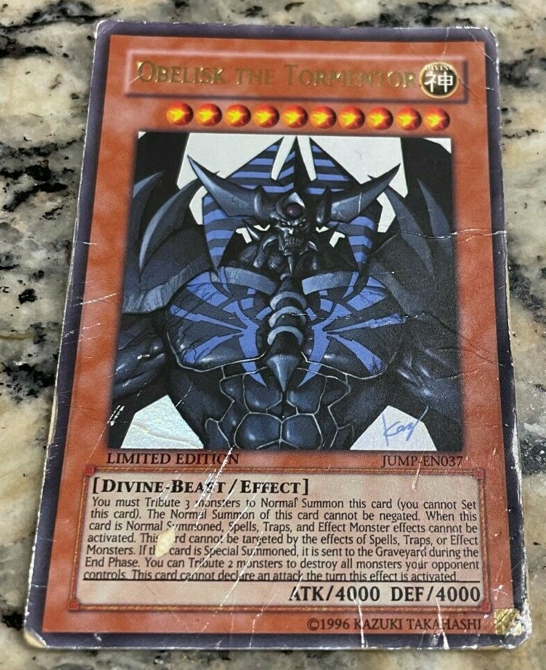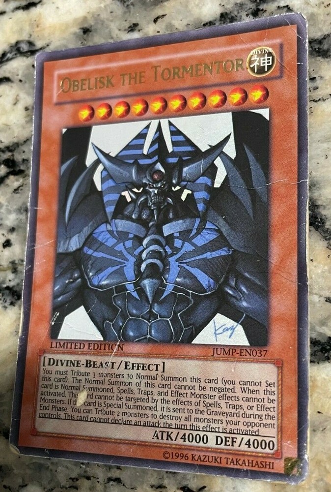 YuGiOh! OBELISK THE TORMENTOR JUMP-EN037 ULTRA DAMAGED Shipped with eBay Standard Envelope for Trading Cards up to $20 or USPS 1st class The card seen in the photo(s) is the card you shall receive. All Yu-Gi-Oh! cards sold by us are guaranteed to be 100% authentic. Please look at the pictures in order to determine the condition of the card. Card will be shipped with sleeve. I would like to stop and thank you for taking your time to take a look.