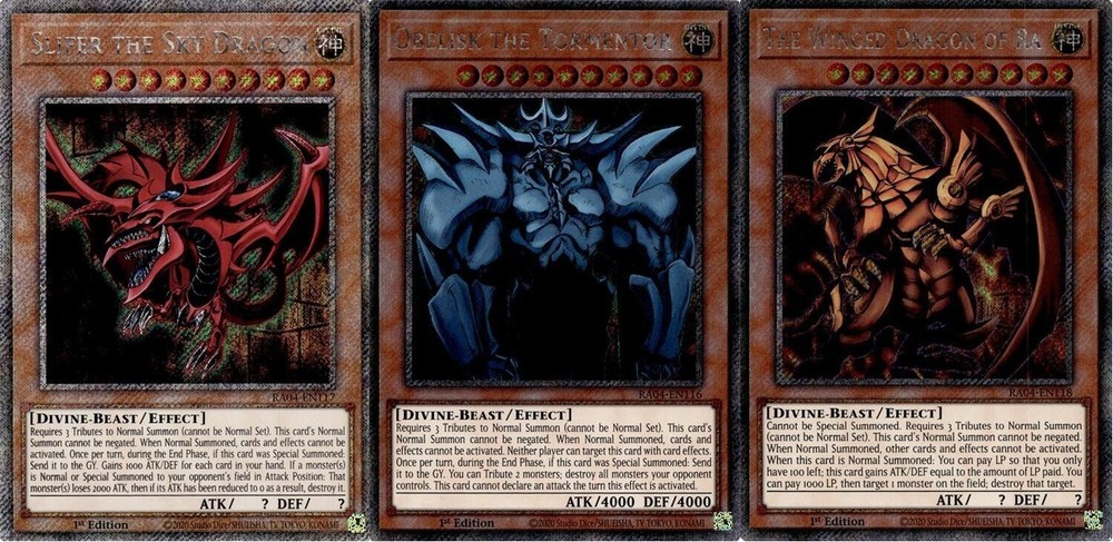 These platinum secret rare God cards are absolutely stunning—Obelisk, Slifer, and Ra shine beautifully with premium holographic foil. Perfect for collectors or competitive duelists, they add serious power and style to any deck. The Quarter Century set details make them even more special, a must-have for any Yu-Gi-Oh! fan!