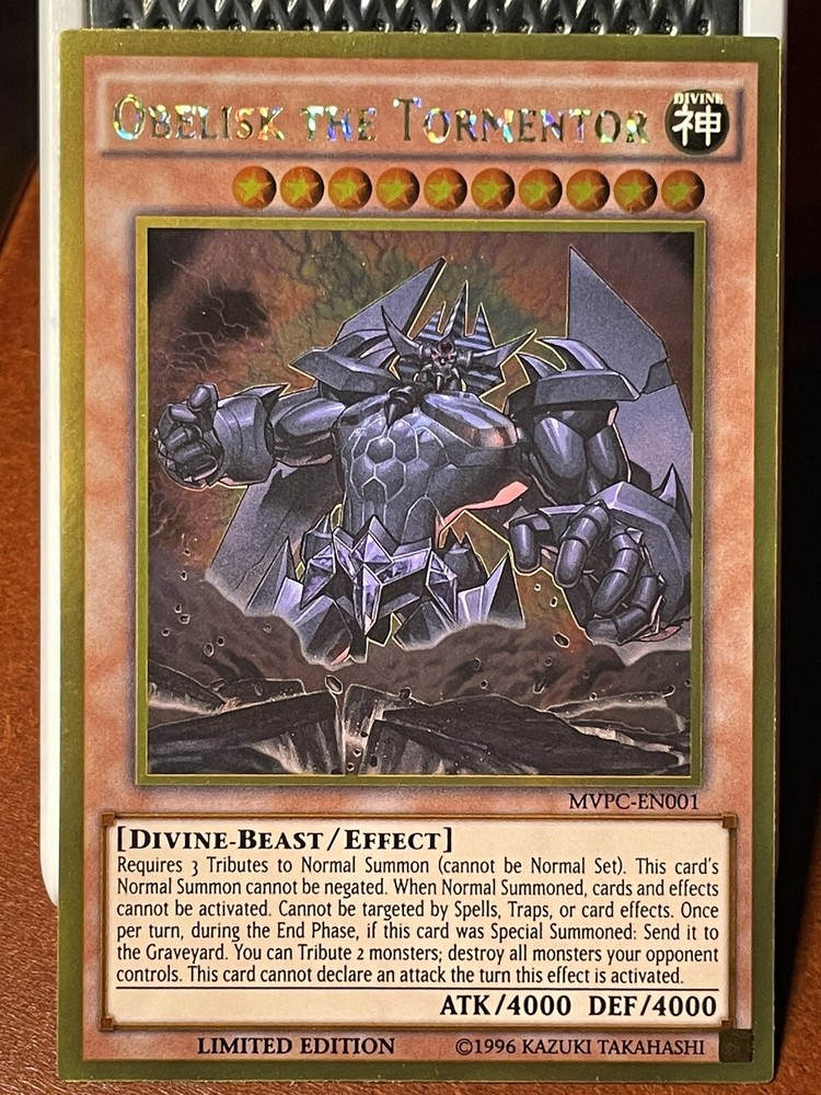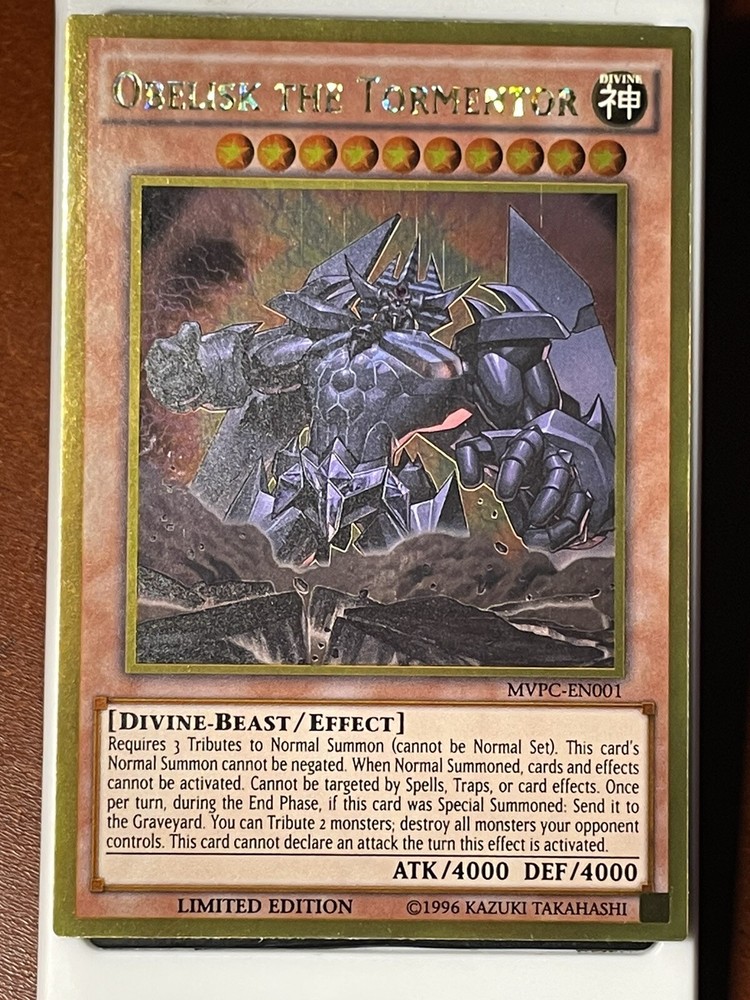 Yu-Gi-Oh! Obelisk The Tormentor 2017 Dark Side of Dimensions DSOD Theater PROMO Gold Rare & Limited Edition card MVPC-EN001. This card is in absolutely PRISTINE condition. Color is great, centering is great, edges and corners all fantastic; no creases, bends, blemishes, scratches, indentations, cuts, folds or marks of any kind on front or back. Could easily be graded; Appears to be Gem Mint or Mint condition card, or at worst Near Mint or better. This card is stored in (and will be shipped in) a sleeve. Photos shown ARE OF THE EXACT CARD YOU WILL RECEIVE, ALWAYS! Thus, please review all pictures for yourself for condition, as the photos are part of the description, and ask any questions you have before buying. The card is sold AS-IS. It will also be shipped in a secure top-loader and very safely packaged. A few additional important notes: 1. PLEASE CAREFULLY REVIEW ALL LISTING PHOTOS, AS THEY ARE PART OF THE DESCRIPTION! I want you to know exactly what you are getting before you receive it – NO SURPRISES is good for you and me! This means that anything showing in a listing photo is not a valid basis for requesting a return or refund. I take great care in posting accurate descriptions and photos, and greatly appreciate you taking the same degree of care in your bidding/buying. 2. Please ASK any questions you may have BEFORE bidding/buying. I would prefer not to have to cancel a placed order when it is easily avoidable simply because you didn’t read my listing title or description carefully. Sadly, this happens far more often than you might think. I am always happy to answer any inquiries or provide any additional detail requested. 3. Please read my feedback! I am a 20+ year eBay "veteran" with a 100% positive feedback record after well more than a thousand transactions with distinct buyers/sellers. This means I CARE about the details, will treat you FAIRLY, and always represent what I am selling HONESTLY and COMPLETELY, to the best of my ability! 4. I am an individual seller of my own personal belongings and collectibles, who has been the buyer for literally thousands of items on eBay, so I care very much about the buying experience being GREAT. I pride myself on handing every transaction as I would want it to be handled if I were the buyer, including very conscientious, safe and secure packing for all items, ALWAYS. So please bid/buy with confidence and know that I will do everything I can to make YOUR experience top-notch, Grade A+! 5. Things beyond our control happen; that is the reality of life on eBay. If something is not to your satisfaction, PLEASE CONTACT ME BEFORE leaving negative feedback, and know that I will work with you to make it right, whatever the circumstance. 6. I will always leave positive feedback for you whenever warranted! Please take a moment after receiving your item to leave positive feedback for me, as well! I would greatly appreciate your time! 7. I do reuse material for packing when possible. Save the planet! Thank you for looking! Cheers! =^)