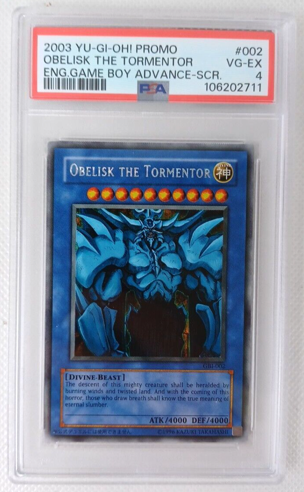 The product is a Yu-Gi-Oh! Obelisk The Tormentor GBI-002 GAMEBOY PROMO Secret Rare card from the Yu-Gi-Oh! TCG. This card is part of the Yugi set and is manufactured by Konami. It is a special EX card made of card stock and was released as a promo in the United States. The rarity of this card makes it a highly sought-after collectible for fans of the Yu-Gi-Oh! game series.