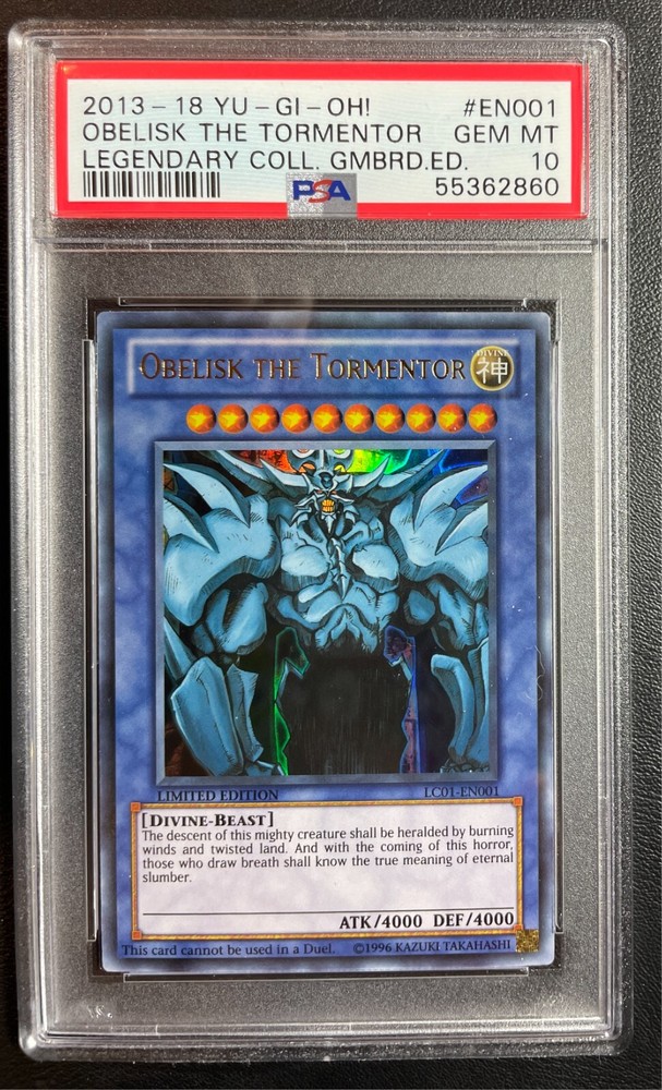 2013-2018 YU-GI-OH! LEGENDARY COLLECTION GAMEBOARD EDITION # EN001 OBELISK THE TORMENTOR PSA 10 GEM MINT PSA Graded Card Condition: " what you see in the picture is what you'll be getting " Item will be sleeved, inserted into a bubble envelope and shipped in a cardboard box. If you have questions please ask BEFORE buying. SHIPPING AND HANDING: Free w/tracking number(Domestic only) ( All International orders will be sent by Global Shipping Program NO EXCEPTION )