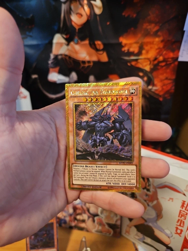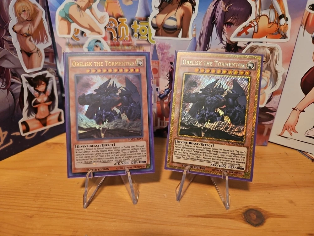 You get both of the cards for the price I listed both are near mint message me if you have questions or need more pictures thank you Unleash the power of ancient gods with the YuGiOh Obelisk The Tormentor MVP1-ENSV5 card, accompanied by its complimentary English version, EN001. These two cards, a must-have for collectors and duelists alike, feature the formidable Obelisk in stunning detail, encapsulated in a holographic foil finish that brings the artwork to life. Produced by Konami, the cards are part of the iconic MVP1 set and are both effect type cards, adding significant strategic depth to any deck. While not autographed, their rarity and the inclusion of both cards make them a remarkable find for enthusiasts of the Yu-Gi-Oh! TCG, enhancing any collection with their distinct Egyptian God powerhouse appeal.