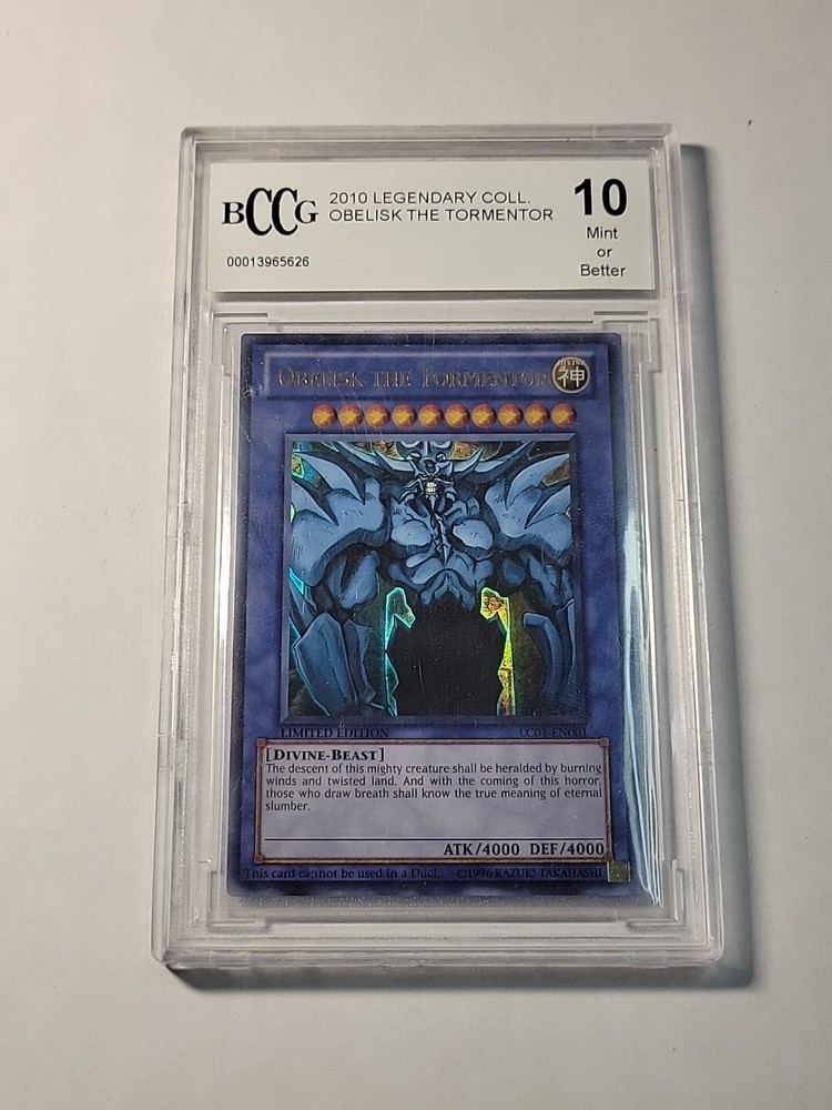 This YuGiOh! card features Obelisk the Tormentor, a powerful and rare creature. The card is from the 2010 Ultra RARE BCCG GEM MINT 10 (A001) collection, making it a highly sought-after item for collectors. The card is in excellent shape and has been well-maintained, ensuring its long-lasting value. It is perfect for fans of the YuGiOh! game or anyone looking to add a unique and valuable item to their collection. Ignore (A001) Thank you!!!
