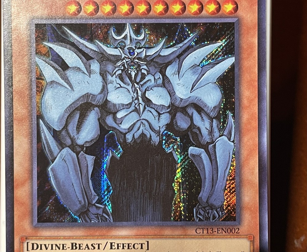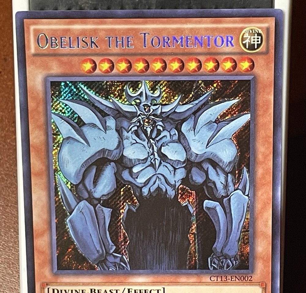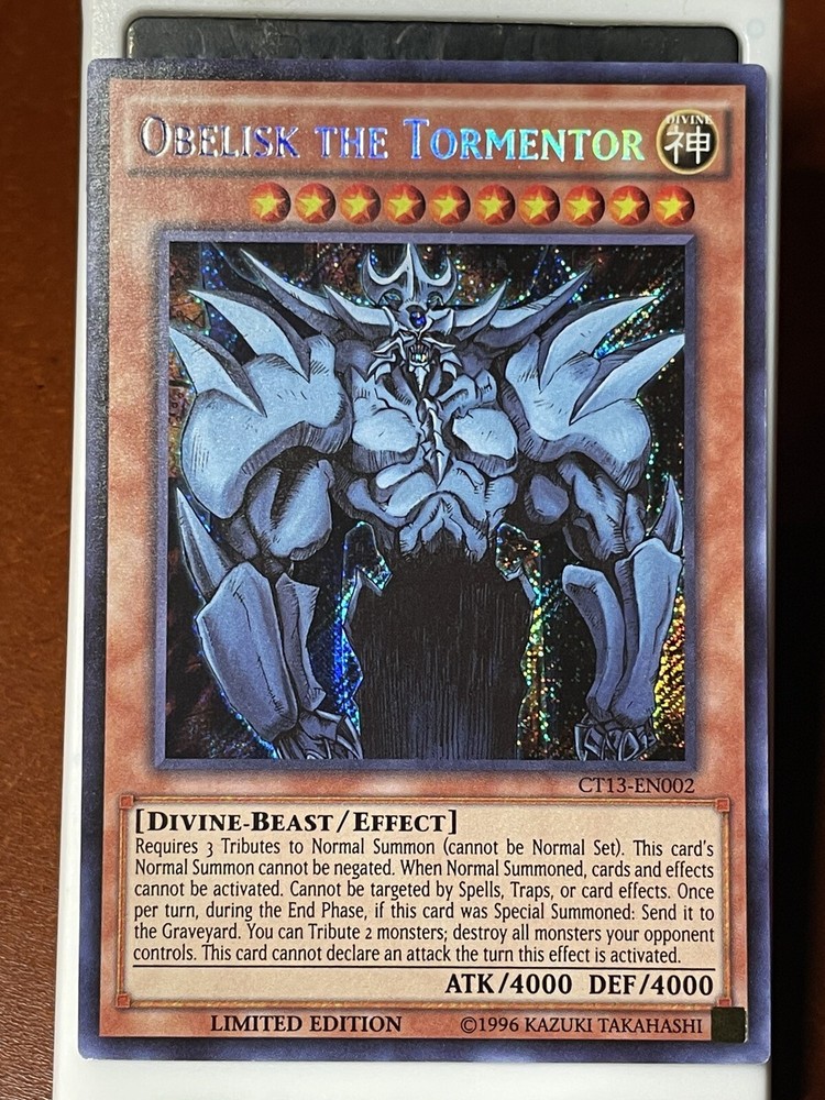 Yu-Gi-Oh! Obelisk the Tormentor 2016 MEGA-TINS PROMO Limited Edition Secret Rare CT13-EN002. This card is in absolutely PRISTINE condition. Color is great, centering is great, edges and corners all fantastic; no creases, bends, blemishes, scratches, indentations, cuts, folds or marks of any kind on front or back. Could easily be graded; Appears to be Gem Mint or Mint condition card, or at worst Near Mint or better. This card is stored in (and will be shipped in) a sleeve. Photos shown ARE OF THE EXACT CARD YOU WILL RECEIVE, ALWAYS! Thus, please review all pictures for yourself for condition, as the photos are part of the description, and ask any questions you have before buying. The card is sold AS-IS. It will also be shipped in a secure top-loader and very safely packaged. A few additional important notes: 1. PLEASE CAREFULLY REVIEW ALL LISTING PHOTOS, AS THEY ARE PART OF THE DESCRIPTION! I want you to know exactly what you are getting before you receive it – NO SURPRISES is good for you and me! This means that anything showing in a listing photo is not a valid basis for requesting a return or refund. I take great care in posting accurate descriptions and photos, and greatly appreciate you taking the same degree of care in your bidding/buying. 2. Please ASK any questions you may have BEFORE bidding/buying. I would prefer not to have to cancel a placed order when it is easily avoidable simply because you didn’t read my listing title or description carefully. Sadly, this happens far more often than you might think. I am always happy to answer any inquiries or provide any additional detail requested. 3. Please read my feedback! I am a 20+ year eBay "veteran" with a 100% positive feedback record after well more than a thousand transactions with distinct buyers/sellers. This means I CARE about the details, will treat you FAIRLY, and always represent what I am selling HONESTLY and COMPLETELY, to the best of my ability! 4. I am an individual seller of my own personal belongings and collectibles, who has been the buyer for literally thousands of items on eBay, so I care very much about the buying experience being GREAT. I pride myself on handing every transaction as I would want it to be handled if I were the buyer, including very conscientious, safe and secure packing for all items, ALWAYS. So please bid/buy with confidence and know that I will do everything I can to make YOUR experience top-notch, Grade A+! 5. Things beyond our control happen; that is the reality of life on eBay. If something is not to your satisfaction, PLEASE CONTACT ME BEFORE leaving negative feedback, and know that I will work with you to make it right, whatever the circumstance. 6. I will always leave positive feedback for you whenever warranted! Please take a moment after receiving your item to leave positive feedback for me, as well! I would greatly appreciate your time! 7. I do reuse material for packing when possible. Save the planet! Thank you for looking! Cheers! =^)