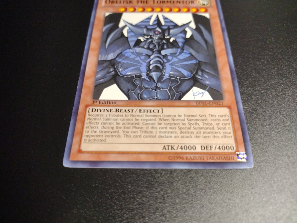 YuGiOh! Obelisk the Tormentor - BP01-EN021 - Rare - 1st Edition Light Play Condition: Please refer to pictures for accuracy - If you need more pictures, let me know. Remember: If you watch this item or any item on my page, I will send an offer! If an offer was already sent and you didn't see it but are still interested, send me a message. Free USPS eBay Letter Shipping! - Keep in mind, I'm paying either out of pocket or out of the sale funds for the shipping. In reality I'm losing a part of the funds from every listing. I want to make sure you get the best price out there! Cards are shipped in a security letter in a plastic top loader. This also comes with tracking. Feel free to check out my other listings. I sell a wide range of items, from trading cards to everyday household products! Thank you!!