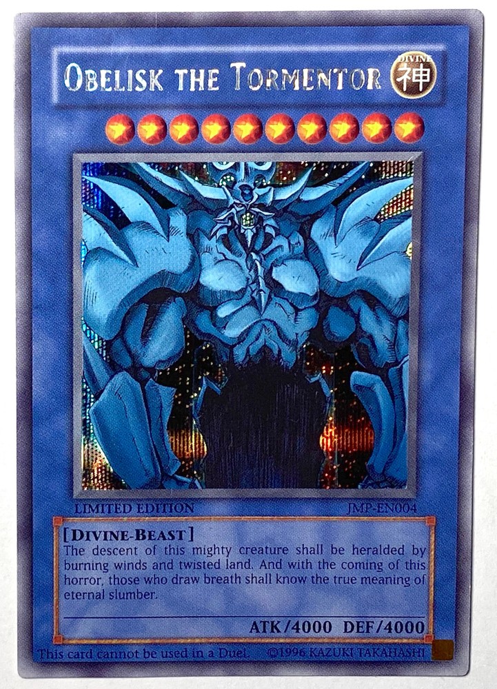 Yu-Gi-Oh! Obelisk the Tormentor JMP-EN004 Limited Ed ition Secret Rare MP See photos. Moderate play with slight curl in upper right corner. Ships USPS Ground Advantage with Tracking....