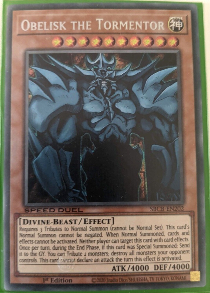 You are buying a Secret Rare, 1st Edition Obelisk the Tormentor from SBCB-EN202 in Near Mint condition. This is a Speed Duel card. Feel free to contact us if you have any Questions or Comments and we will get back to you ASAP. Our postage options: Domestic: Standard (Cheapest option) Domestic Tracked Letter (Tracked) Express (Tracked, fastest delivery) International: We currently only have Express and Registered (untracked with signature) postage due to delays caused by the current pandemic however if you interested in purchasing an item through Standard International Postage (Untracked) feel free to contact us. If you would like to combine postage over multiple items but are unable to please select the request total button or send us a message and we can help you out. Thanks for shopping with ChaosTCGAus! We Hope to see you again Listing and template services provided by inkFrog