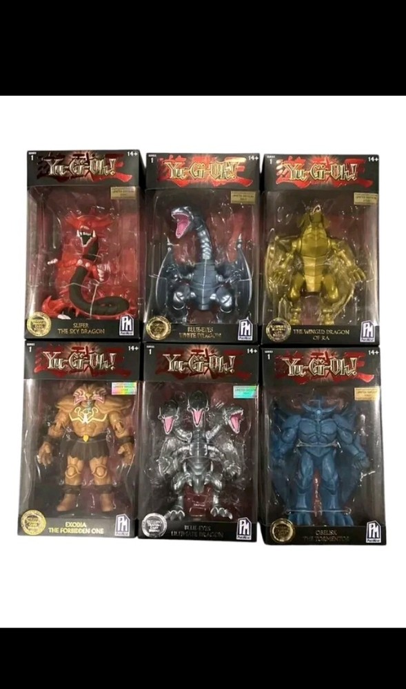 This Yu-Gi-Oh! PhatMojo Series 1 Set includes all 6 figures: Obelisk the Tormentor, Blue-Eyes Ultimate Dragon, The Winged Dragon of Ra, Exodia the Forbidden One, Blue-Eyes White Dragon, and Slifer The Sky Dragon. The set is an original and comes in its original packaging (unopened), making the perfect addition to any collector and collection. The figures are made of high-quality and design. The set is part of the Expanded Universe series and is licensed by the Yu-Gi-Oh! franchise. It is limited, special, and exclusive edition.