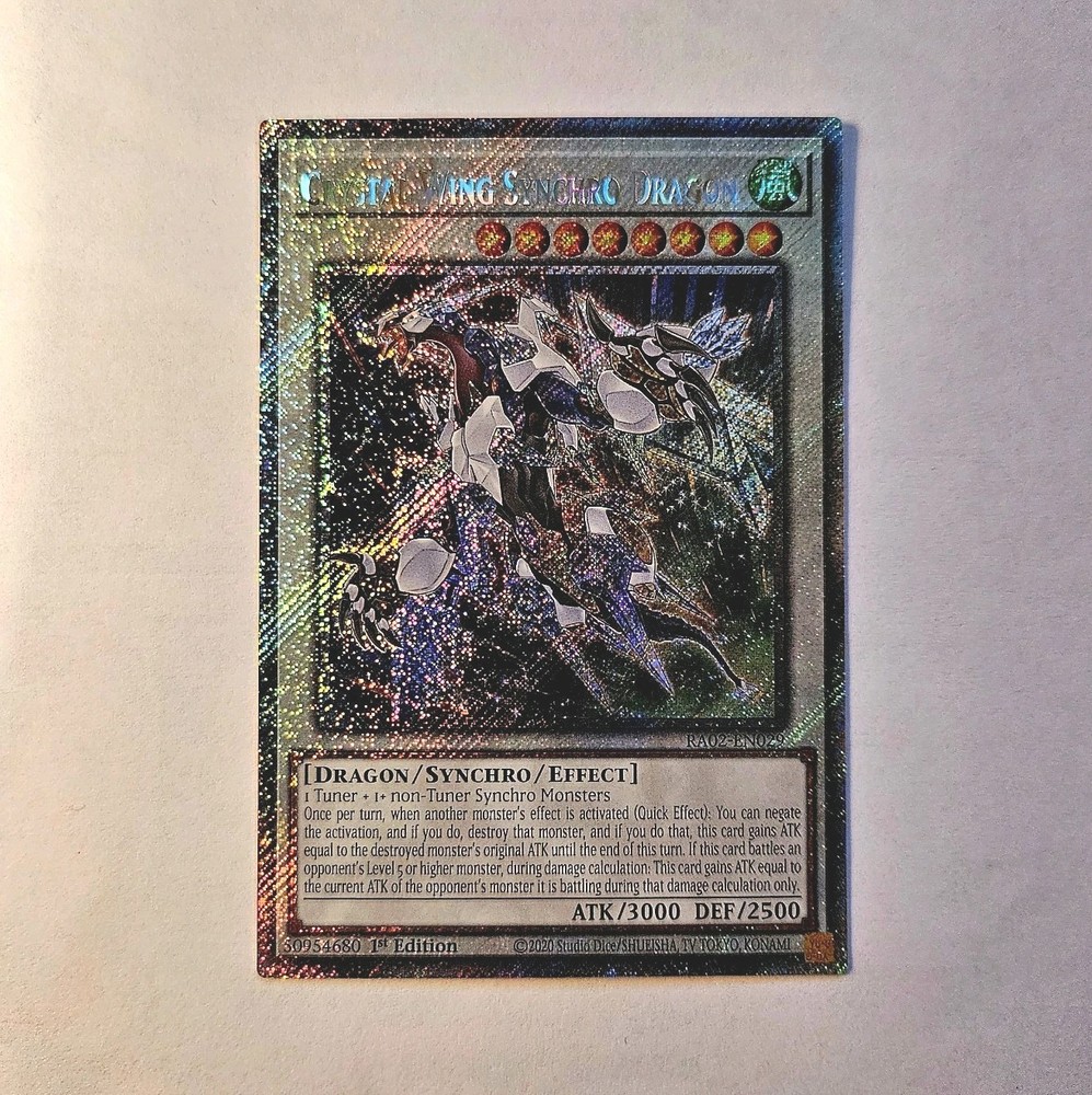 This Platinum Secret Rare Crystal Wing Synchro Dragon is absolutely stunning! The holographic finish makes the artwork pop with incredible detail, and the 1st Edition stamp is a nice touch for collectors. The seller provides actual scans so you know exactly what you're getting—no stock photos here. Shipping is reasonable, especially if you bundle multiple cards. A must-have for any serious Yu-Gi-Oh! enthusiast!