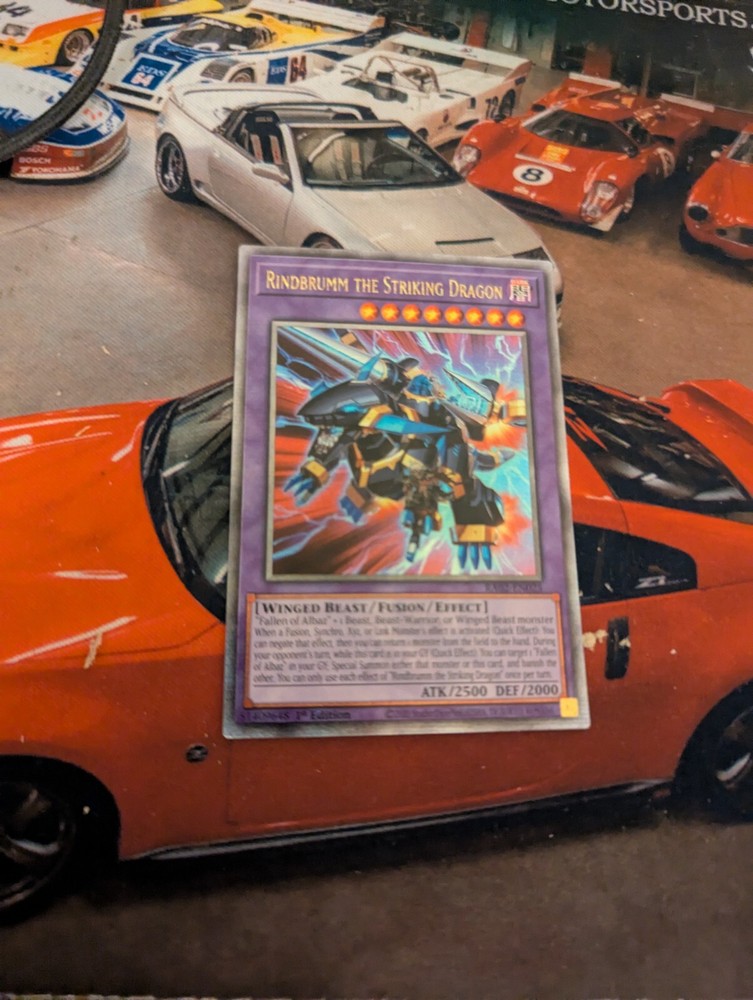 Product Details "Fallen of Albaz" + 1 Beast, Beast-Warrior, or Winged Beast monster When a Fusion, Synchro, Xyz, or Link Monster's effect is activated (Quick Effect): You can negate that effect, then you can return 1 monster from the field to the hand. During your opponent's turn, while this card is in your GY (Quick Effect): You can target 1 "Fallen of Albaz" in your GY; Special Summon either that monster or this card, and banish the other. You can only use each effect of "Rindbrumm the Striking Dragon" once per turn.